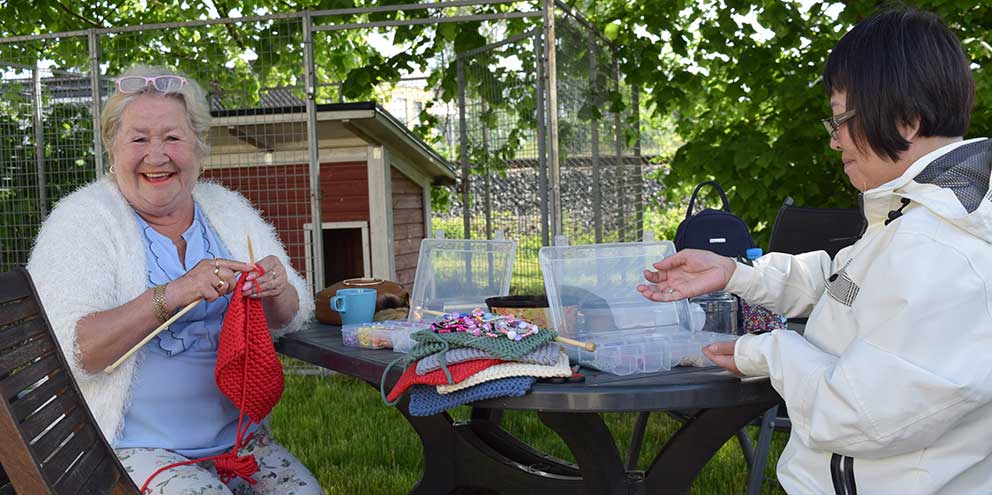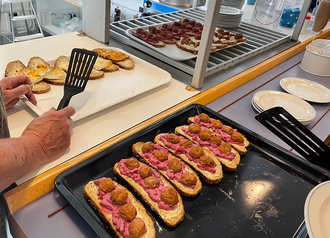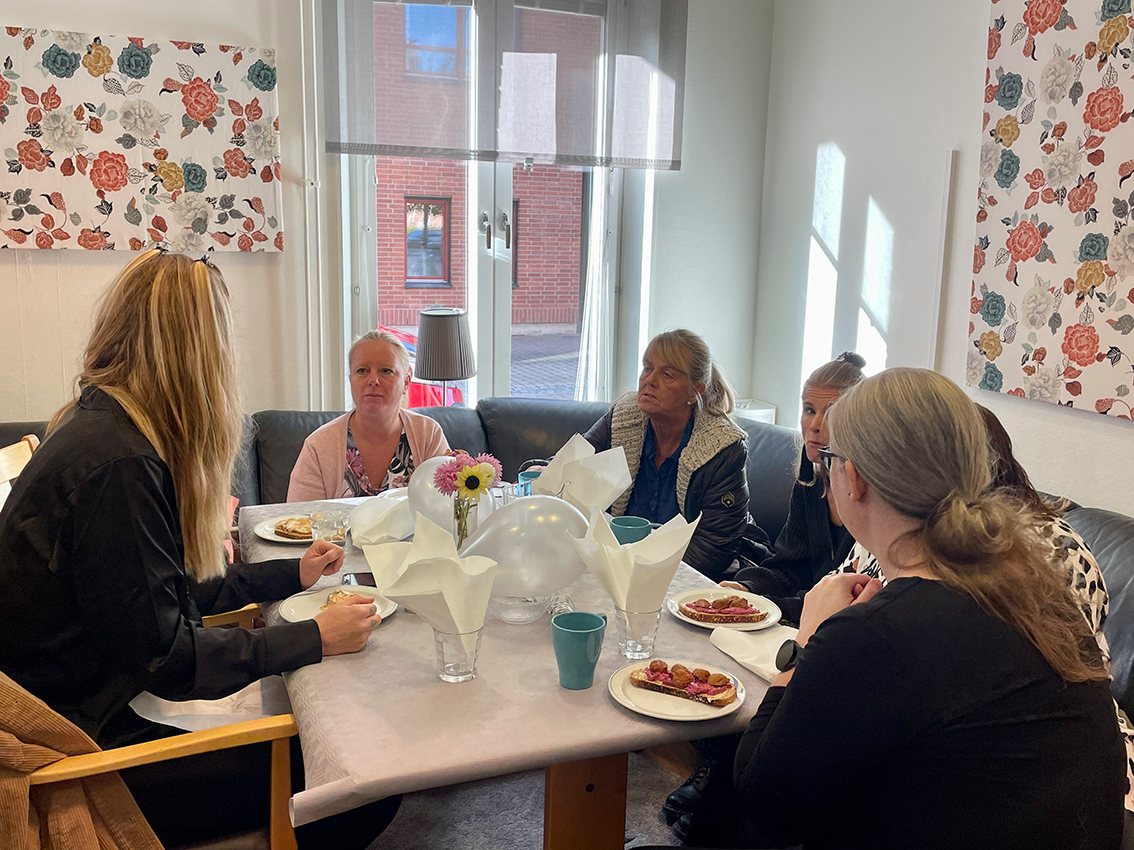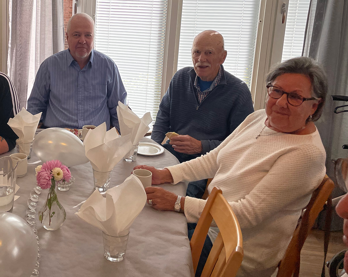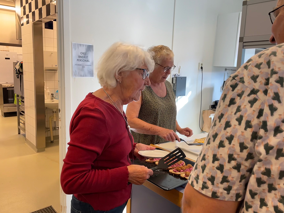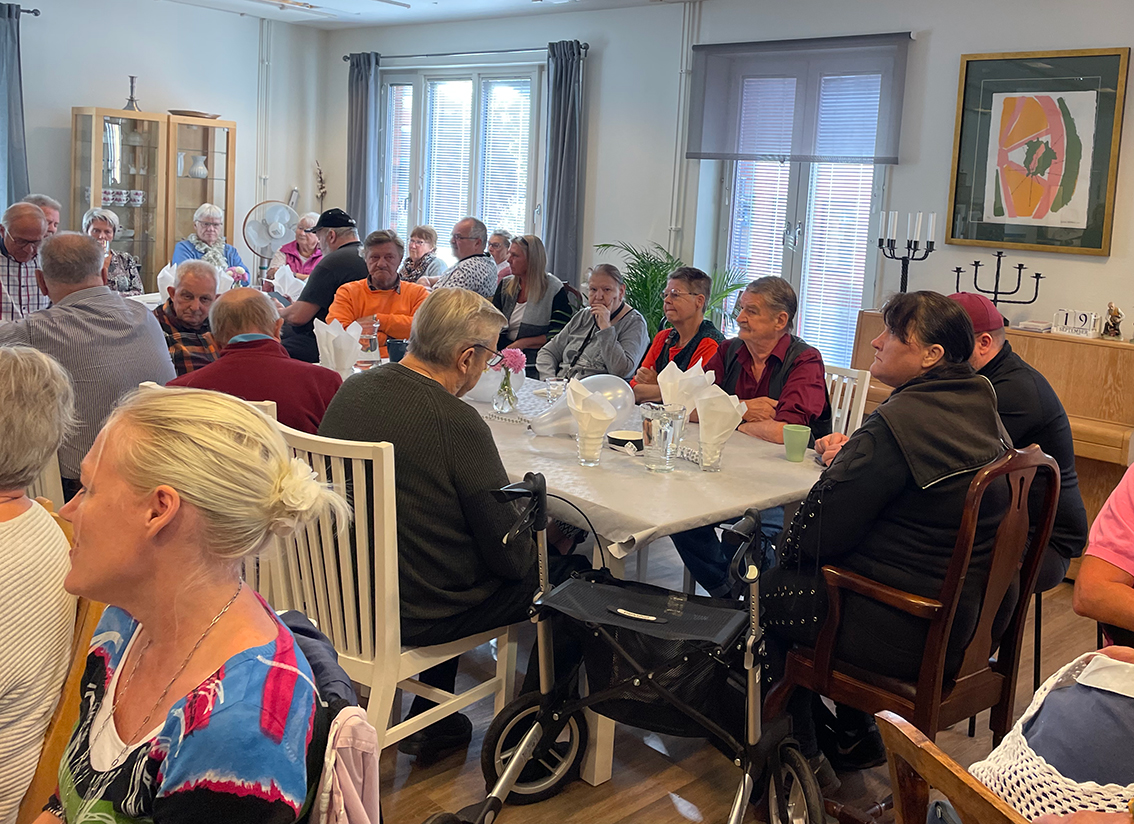 En dam som sitter och fikar vid bordet berättar: – Många kommer hit varje dag, det är många som behöver ett ställe att träffa andra. Jag går hit måndag och torsdag varje vecka sedan jag blev pensionär, det är jättetrevligt!