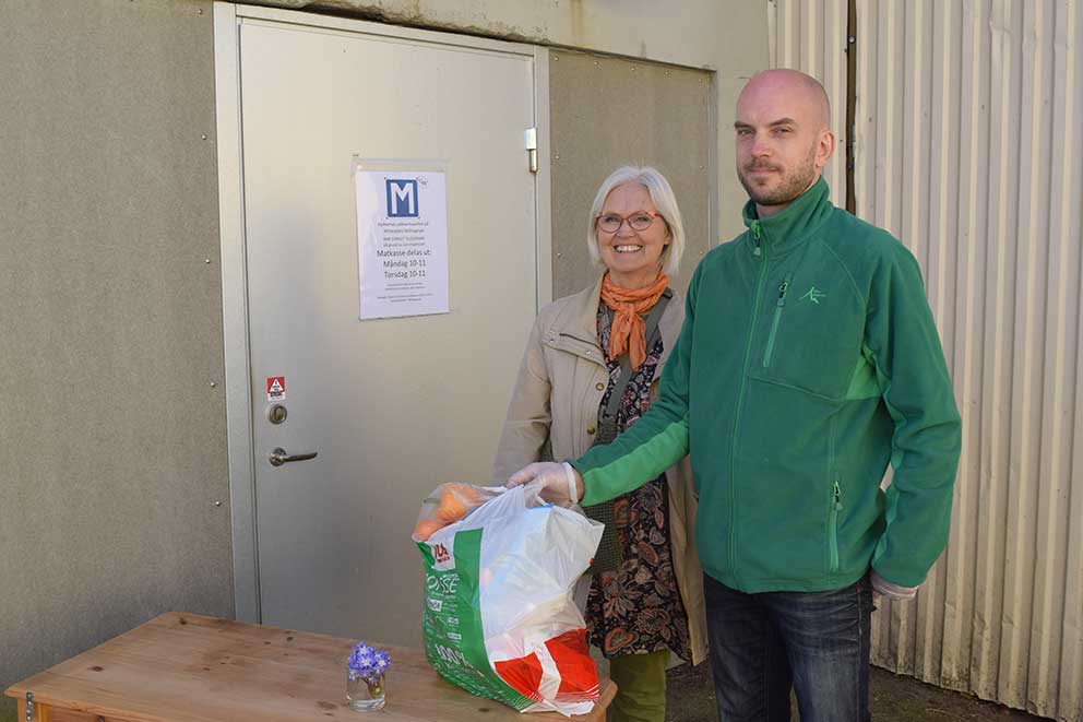 Själva Mötesplatsens lokal är fortfarande under renovering efter vattenskadan tidigare i vår. Men matkassarna delas ut som tidigare. Läget som råder har gjort att ett bord har ställts ut utanför och de behövande får hämta där. Ett 20-tal matkassar delades ut under skärtorsdagen och kyrkorna hade gjort innehållet lite extra gott.