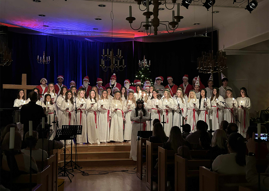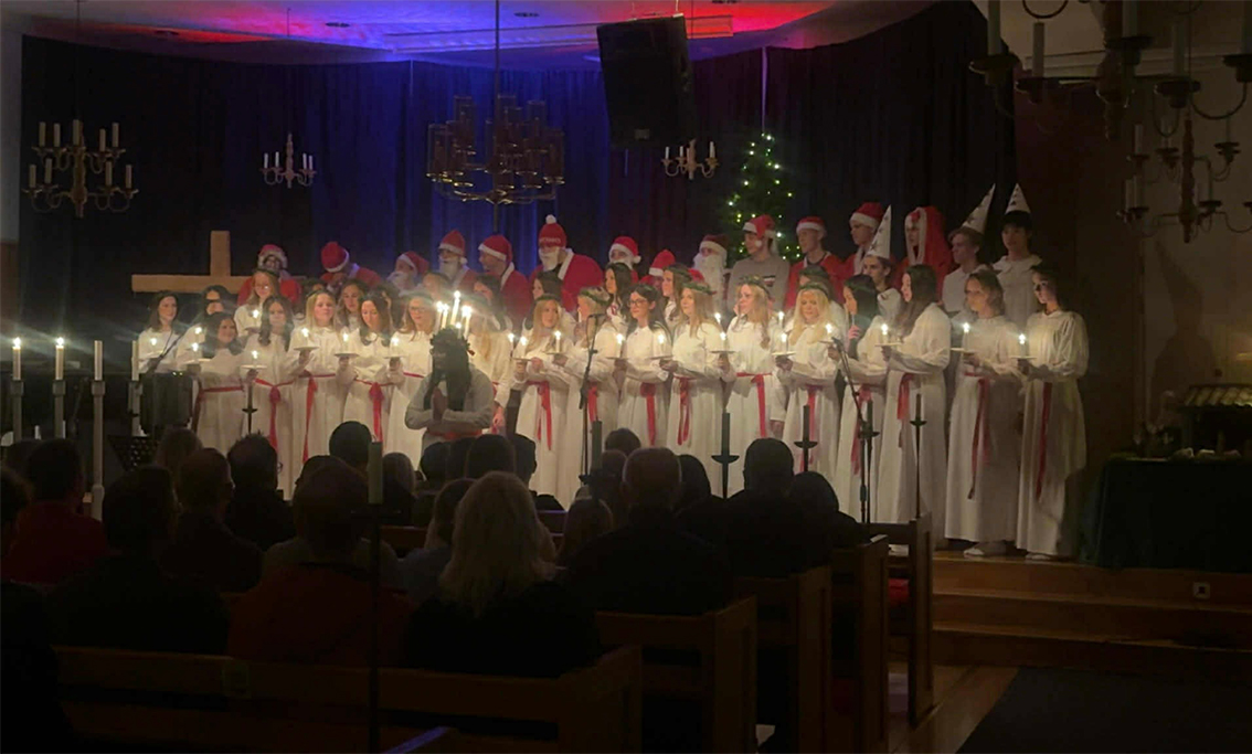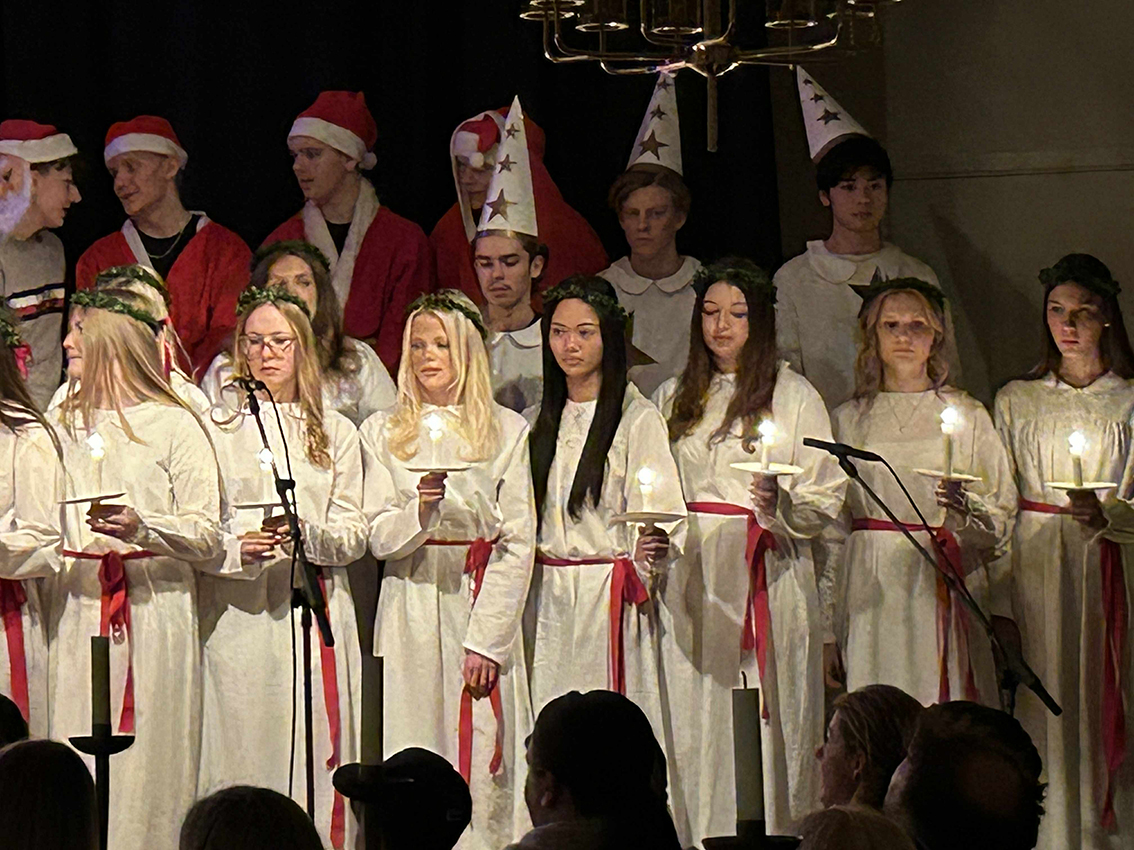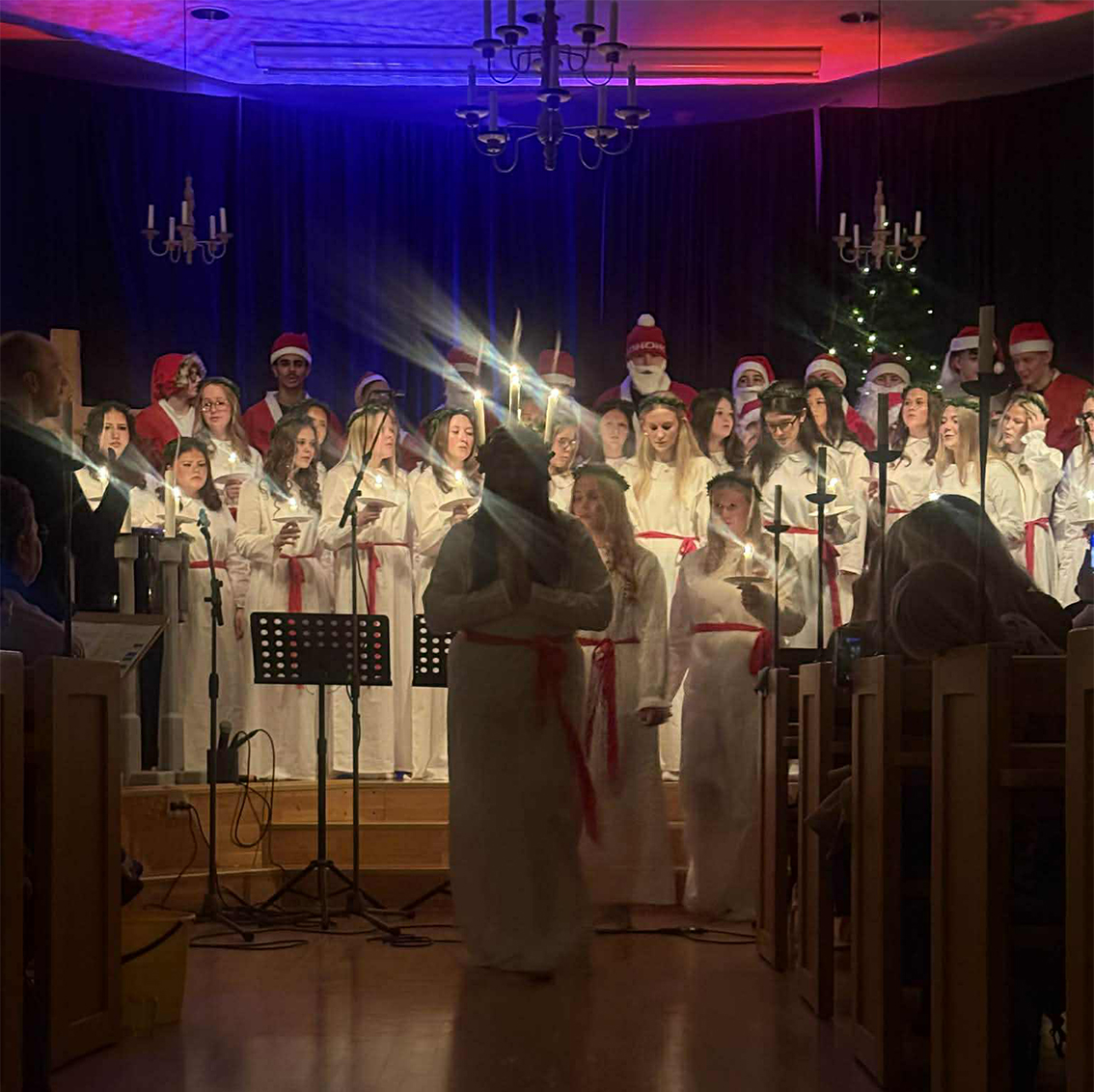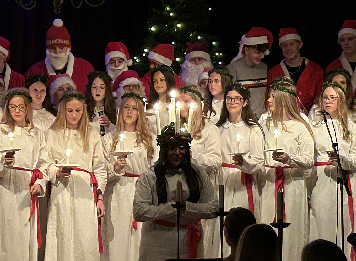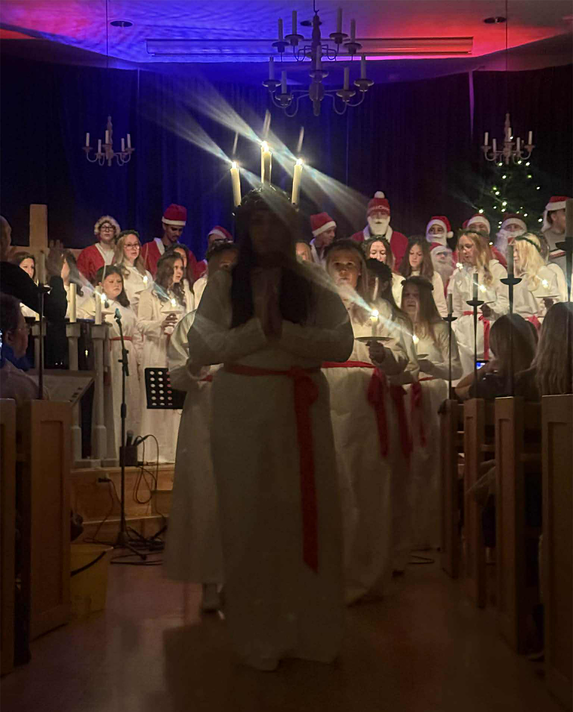 Den här morgonen fylldes Equmeniakyrkan av lussefirande niondeklassare från Hjortsjöskolan. Då bjuder de åttorna och sjuorna på luciatåg. I går kväll fick elvernas familjer en förhandsvisning.