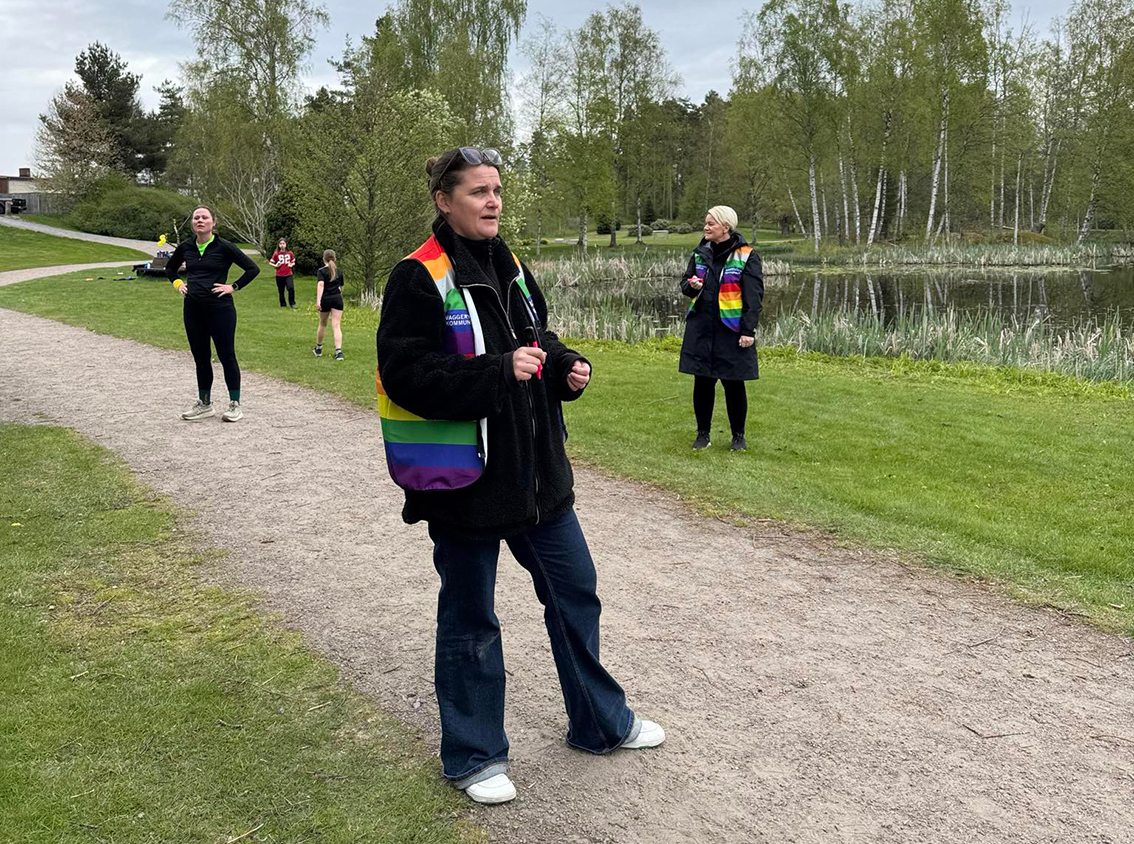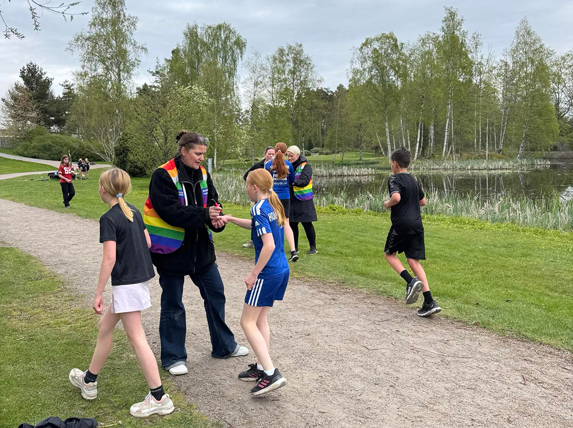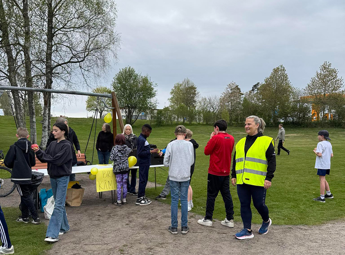 Under fredagen samlades alla elever på mellanstadiet, en årskurs i taget, i parken vid Preem. Väl på plats var det gemensam uppvärmning som leddes av fritidspersonal och sedan gick startskottet för loppet. Alla elever deltog utifrån sin egen förmåga och det resulterade i många varv runt dammen för var och en. För att hålla koll på hur många varv de sprang så stod det skolpersonal vid målgången och markerade elevens hand med en prick för varje varv. Runt om dammen var det fint pyntat med skyltar som hade peppande budskap, ballonger och musik som spelades. Representanter från Rynkebyloppet fanns på plats och hejade med glada tillrop på alla löpare!