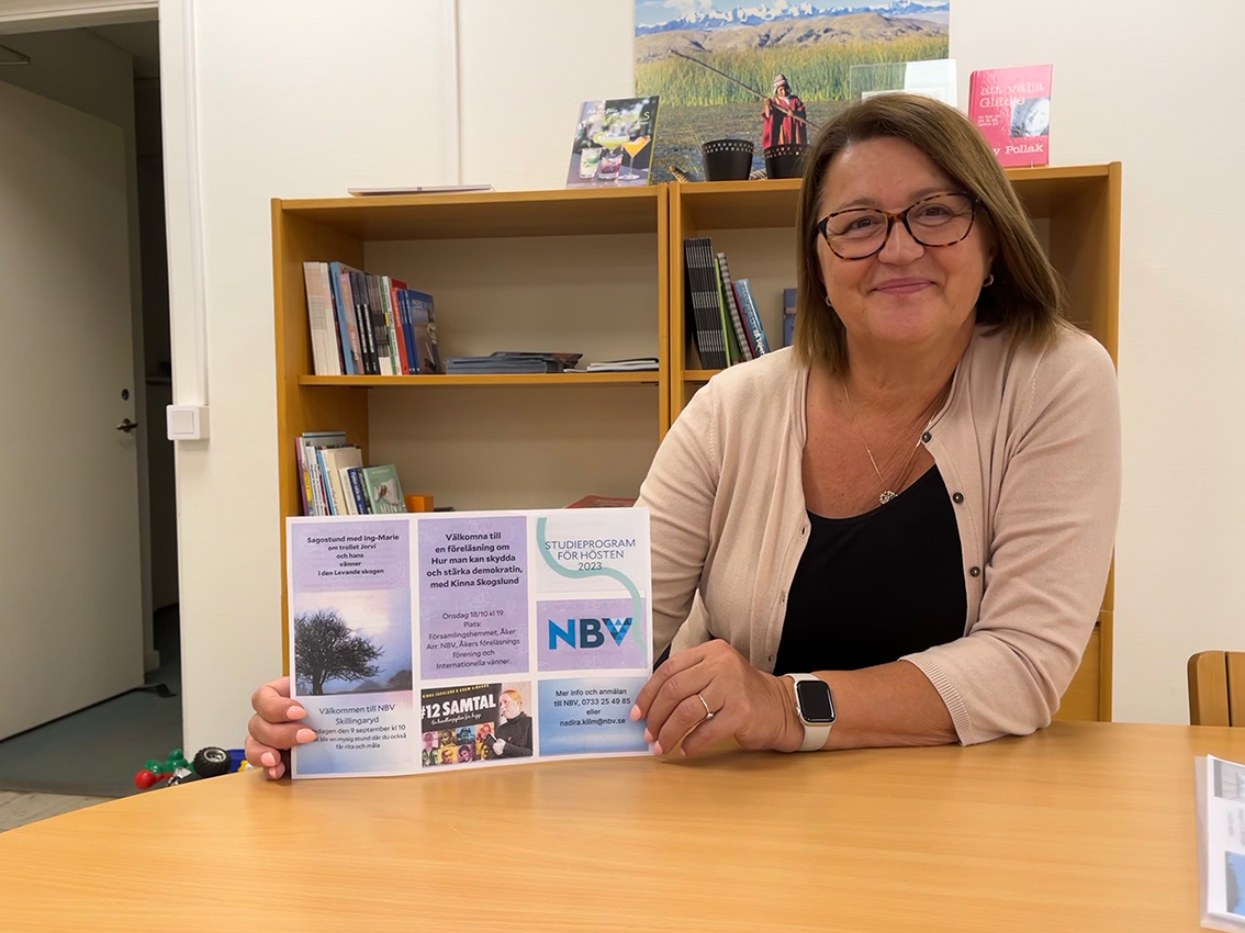 – NBV är ett nationellt studieförbund för folkbildning och våra grundläggande idéer är nykterhet, demokrati och bildning. Vi jobbar med folkbildning och tror på folkbildningens kraft att utveckla samhället och demokratin. Frågan är hur samhället skulle se ut utan folkbildning? En mötesplats och bra diskussioner betyder mycket för en själv, för gruppen, för föreningar och så klart för hela samhället. Vi har tätt samarbete med olika föreningar och grupper där vi stöttar på olika vis. Vi är det enda studieförbundet som har en egen lokal i kommunen och den är vi så tacksam för, den används flitigt av olika föreningar och grupper. Till exempel av Samlarklubben och Östbo historiska som har sina öppet hus hos oss.