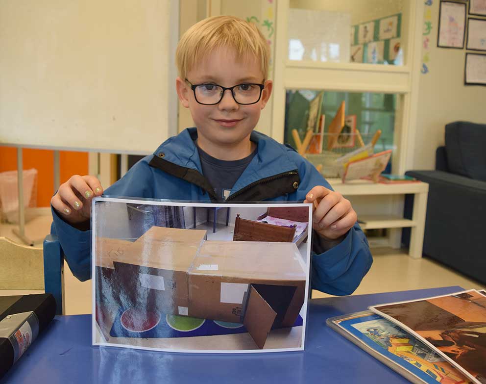 – Vi har byggt hus av stora kartonger. I huset finns kök, vardagsrum, sovrum och toa. Vi ritade först hur det skulle se ut, sen byggde vi. Vi har fått grejer från Remida, sånt som ska återanvändas, så vi har byggt flera hus och vi har fått tygbitar och små kakelbitar, berättar Nils och Thom tar fram ”Tre små grisar bygger hus” där all nödvändig information finns för att kunna bygga ett hus.