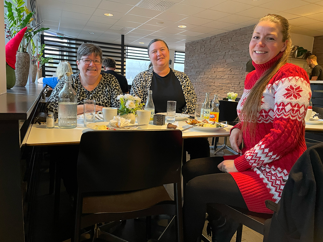 Sandra Gundstedt, Anne Karlsson och Hanna Fahlgren satt till bords: – Maten var god, mycket sallad och efterrätt. Vi har saknat matställe i Vaggeryd som har husmanskost. Buffé är en bonus, då får man välja vad man vill, säger lunchtrion.