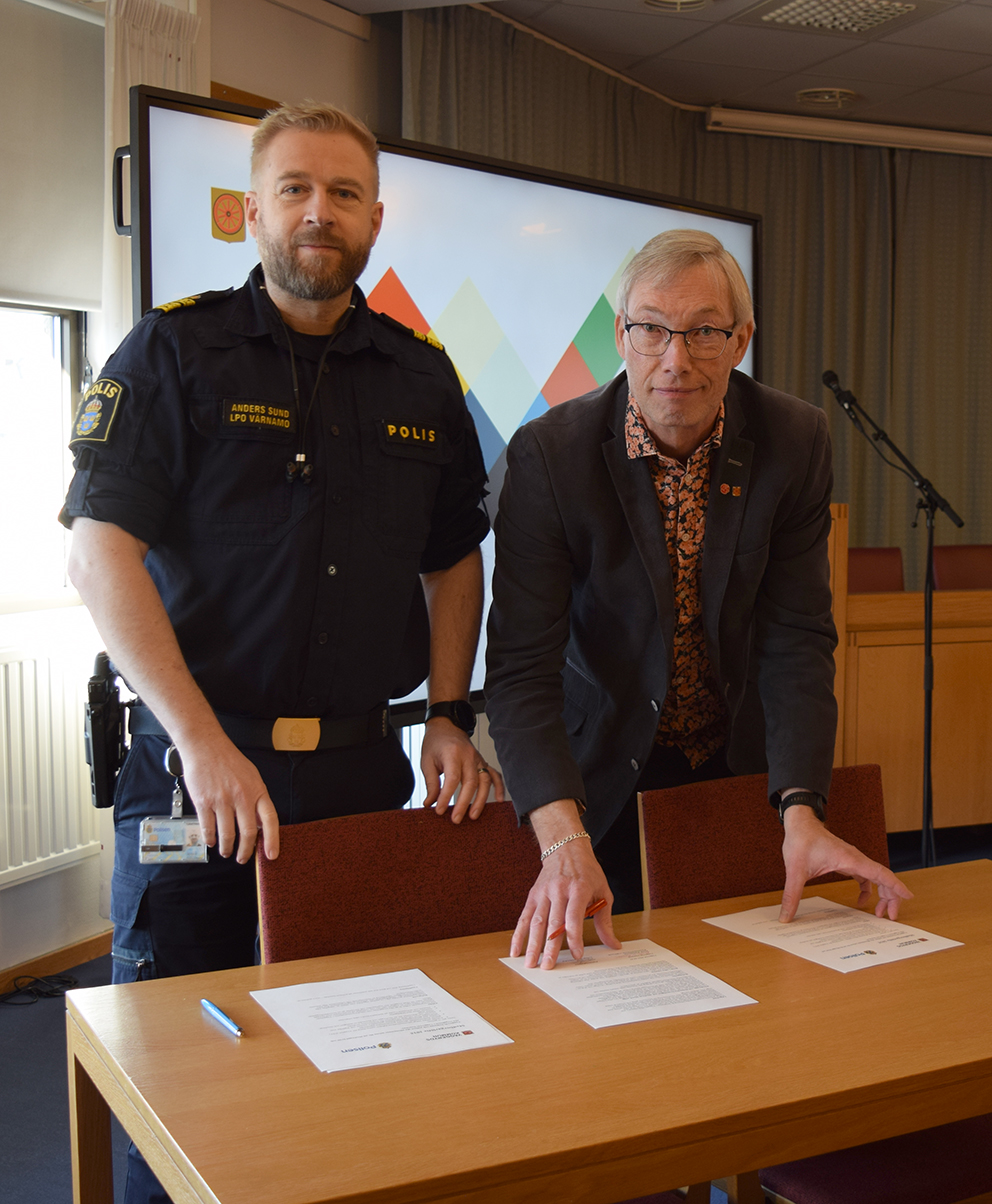 Kommunstyrelsens ordförande Kenth Williamsson (S) skriver på medborgarlöftet för första gången i sin roll och berättar: – Vi har ställt oss bakom löftet mellan polis och kommun. Vi är en trygg kommun och vi har ett bra samarbete med polisen. Vi arbetar mycket förebyggande för ett tryggt samhälle, en del i förebyggande arbetet är informationen som polisen gör ute på våra skolor. Vi har många som hjälper till för att göra samhället tryggt och säkert. När vi tittar på årets första del är siffrorna år rätt håll.