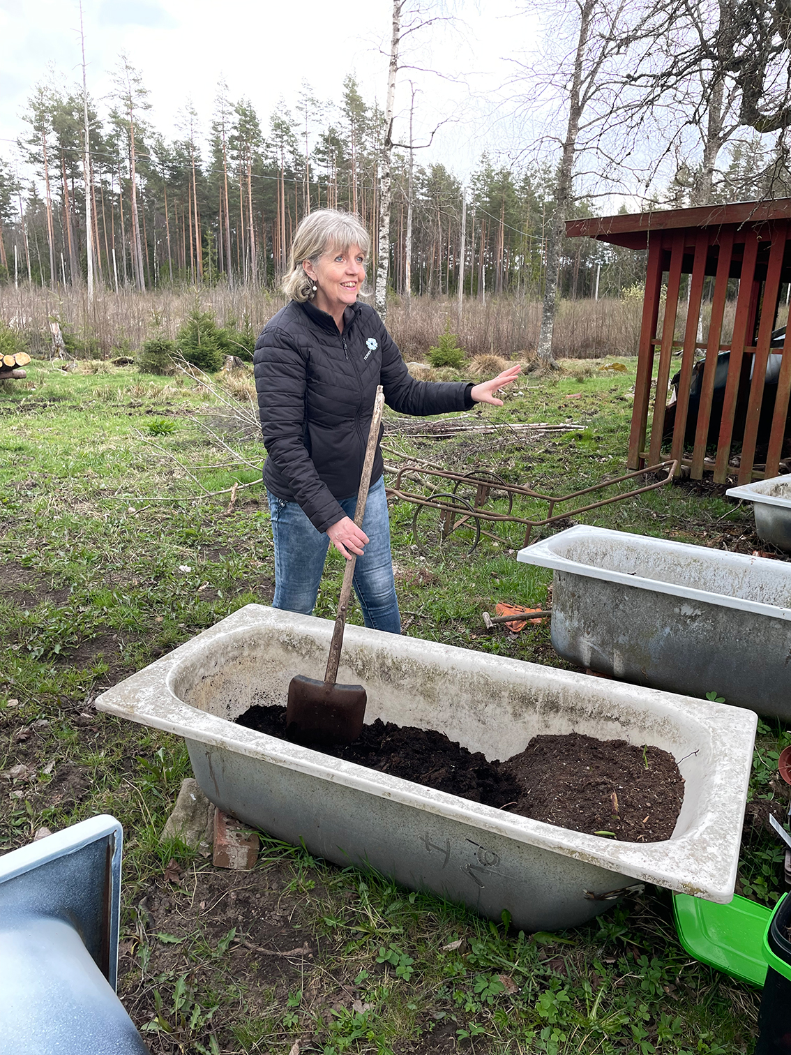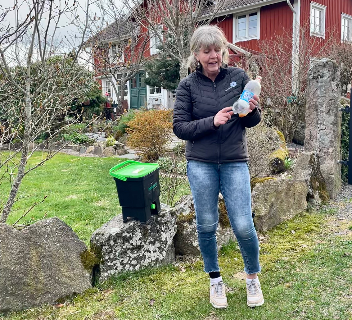 – När bokashin kommer i kontakt med jord så händer det grejer. Efter ett par veckor har det hänt jättemycket. Jag blandar min bokashi och jord i ett badkar ute för att mina hundar gräver i trädgården. Annars går det bra att göra direkt i landet. Nu har jag mycket jord och jag känner mig så rik, säger Susanne Smedberg.