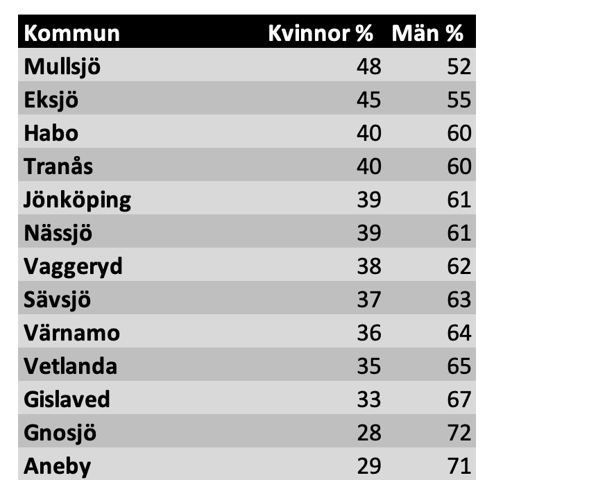 I Jönköpings län är det ingen kommun som har fler kvinnliga chefer än manliga. Bäst är Mullsjö som har 48 procent kvinnliga chefer. En kommun i länet utmärker sig åt andra hållet.