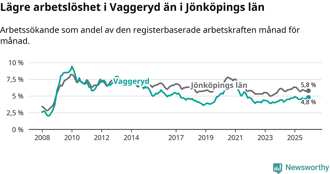 Vaggeryd går därmed mot strömmen i förhållande till andra kommuner i Jönköpings län. I de flesta andra kommuner i länet går arbetslösheten nedåt. Störst är minskningen i Tranås, där arbetslösheten sjunker med 1,1 procentenheter.