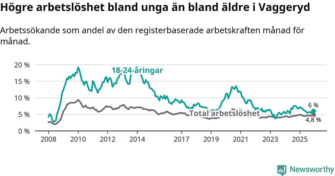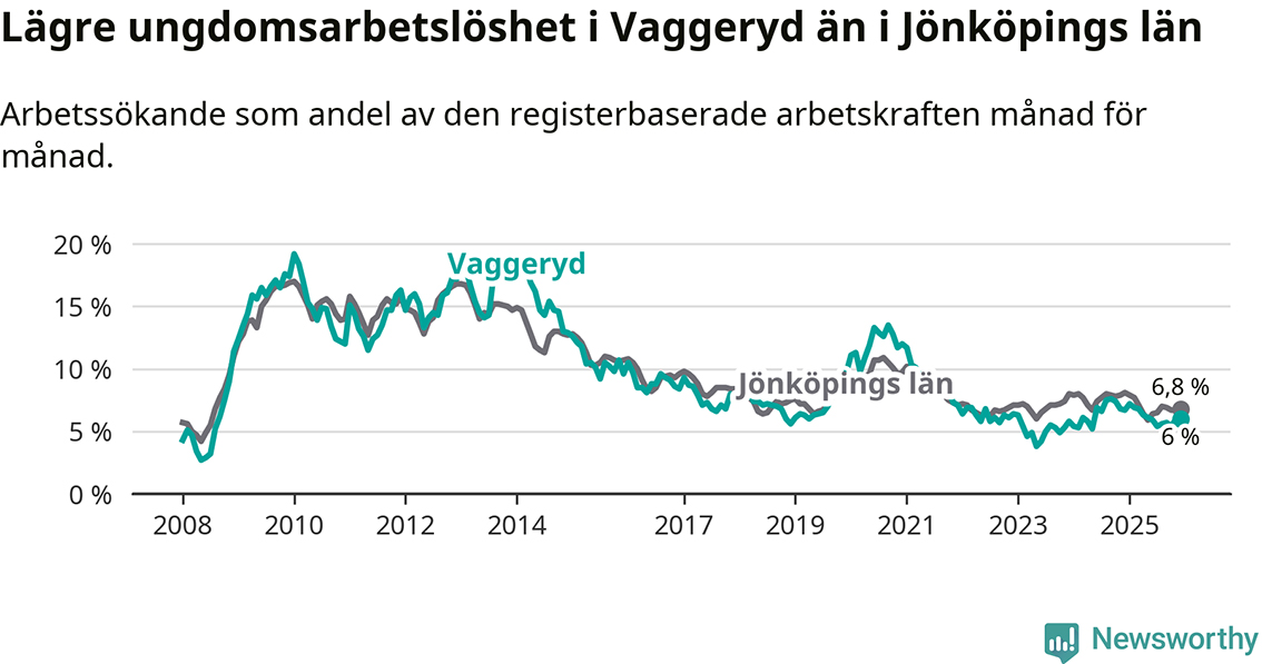 I och med den senaste månadens nedgång har de ungas arbetslöshet i Vaggeryd sjunkit sju månader i följd (ner från 6,1 procent i maj 2025 till 6,0 procent nu).