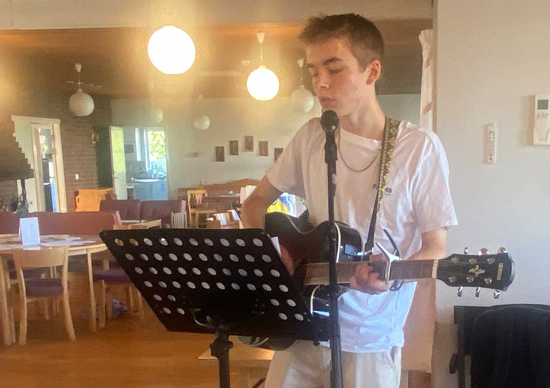 Efter fikastunden underhöll Gustav Fritz med sång till eget gitarrkomp.
