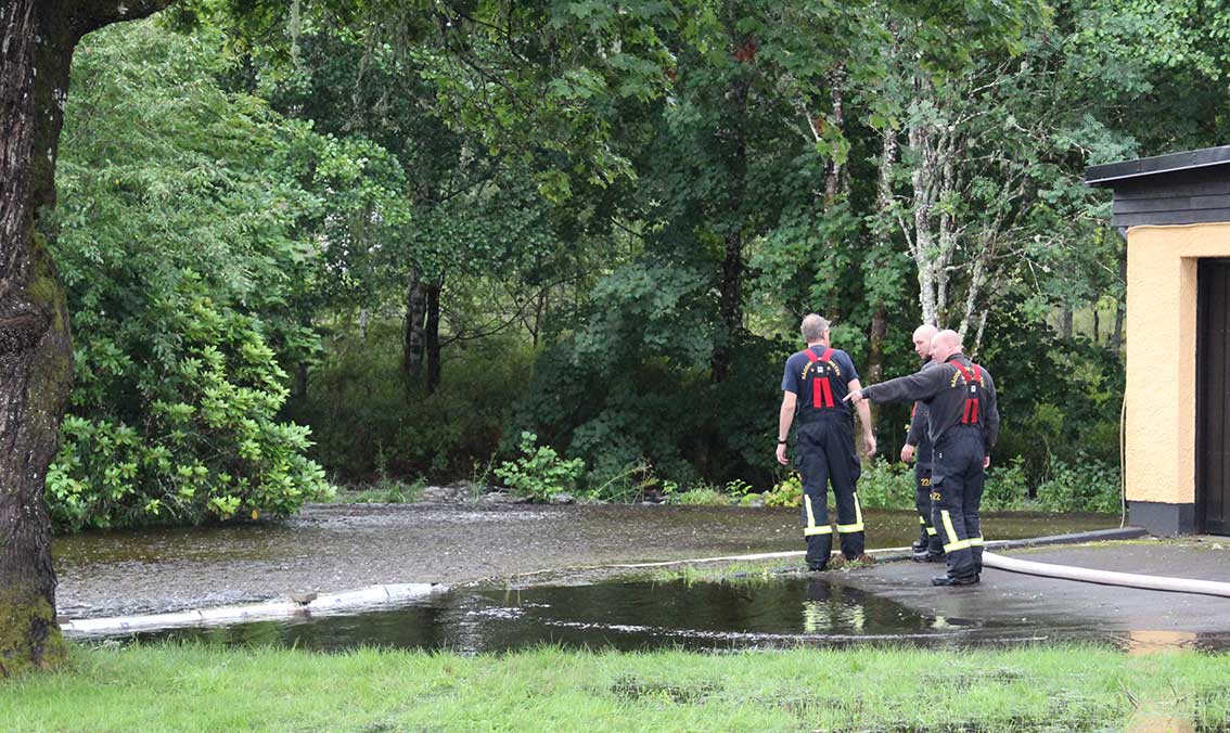 För att säkra garaget sätts cementlängor upp innan regnvattnet kommer.