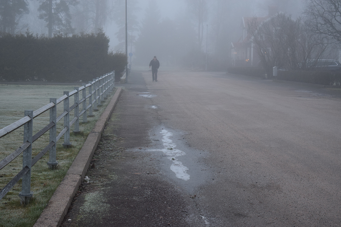 Thomas går norrut på Skolgatan där regnvattnet kommer från