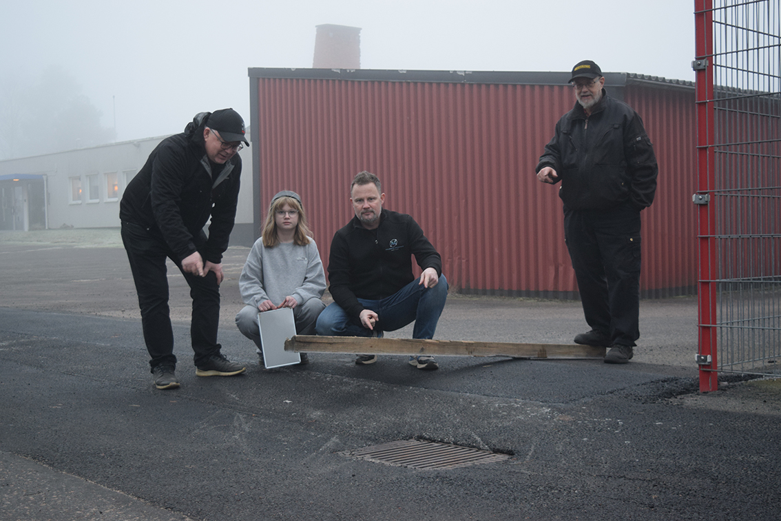Thomas, Nellie, Johan och Conny vid "farthindret" som är byggt vid infarten från Skolgatan