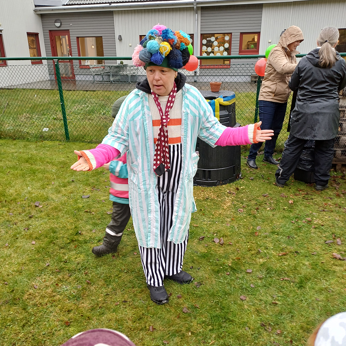 Barnen hade med sig fruktskal och det blev stor aktivitet när vi letade fler maskar till komposten. PomPom är en av förskolans egen cirkusartist som barnen som gått på sommarförskolan är väl bekanta med. PomPom hade inte så stor kunskap om hur en kompost fungerar men barnen kunde berätta!