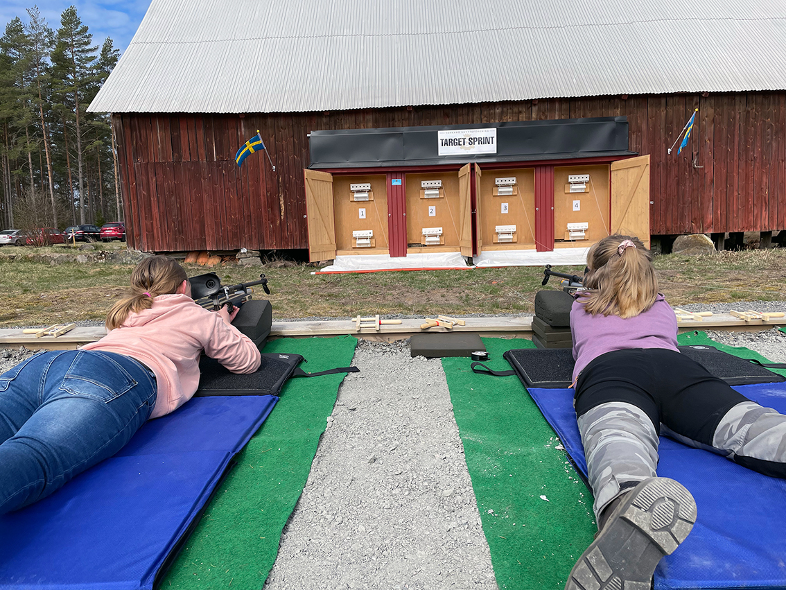 Förra sommaren gjordes en smygstart av Target Sprint-skyttet men den officiella invigningen fick vänta till den  fina majdagen. Efter ett välkomsttal från Lars Bergdahl fick fyra skyttar från föreningen äran att springa genom invigningsbandet: Camilla Björnsdottir, Rasmus Rydberg, Karl Lagerman och Emil Lagerman. De sprang tre varv x 400 meter mixat med två skjutningar med luftgevär mot fallmål. För de som inte ville springa så långt fanns även ett kortare varv på 160 meter. På plats fanns också inbjudna skyttar från föreningarna i Skillingaryd, Kärda, Anderstorp, Rydaholm, Burseryd och Älmhult. Man kan skjuta både liggande och stående och en av de som vågade sig på stående var Kattis Andersson från Älmhult: