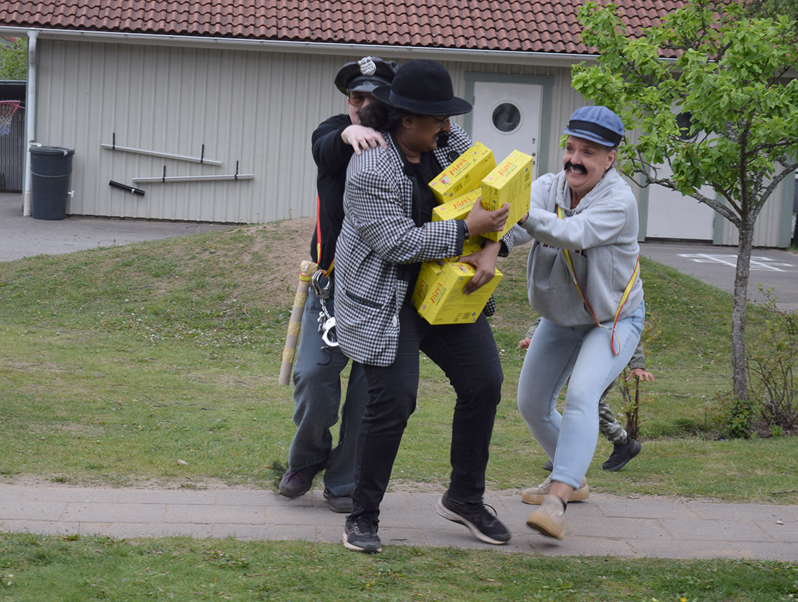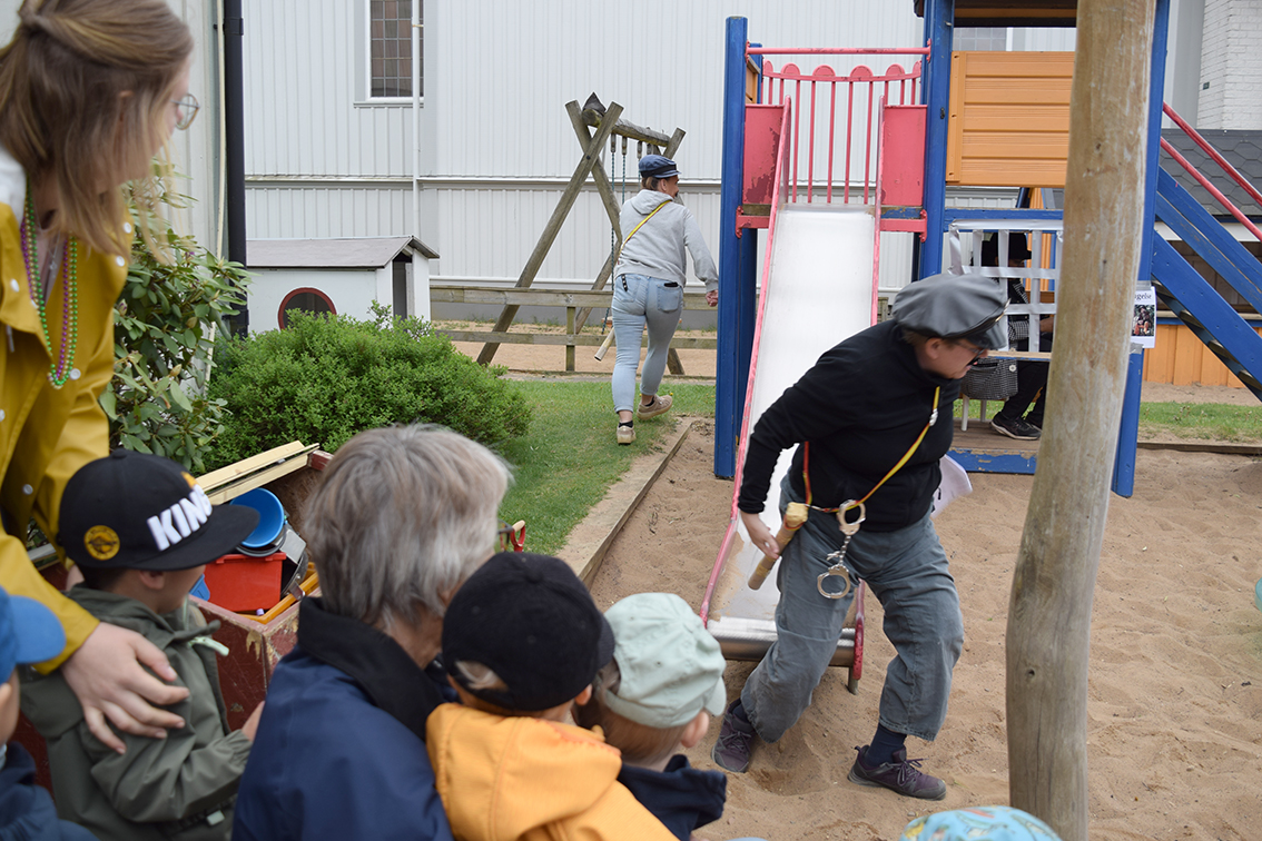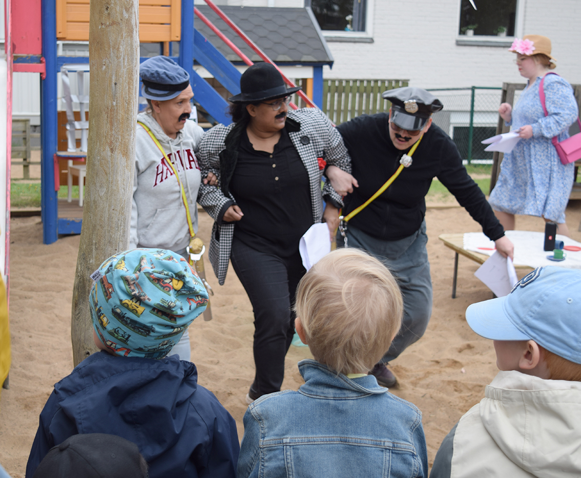 Tjuven Blom kom, Kling och Klang jagade, barnen skrattade, Blom hamnade bakom galler under lekställningen i sandlådan.