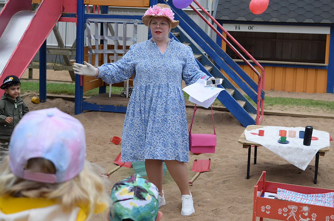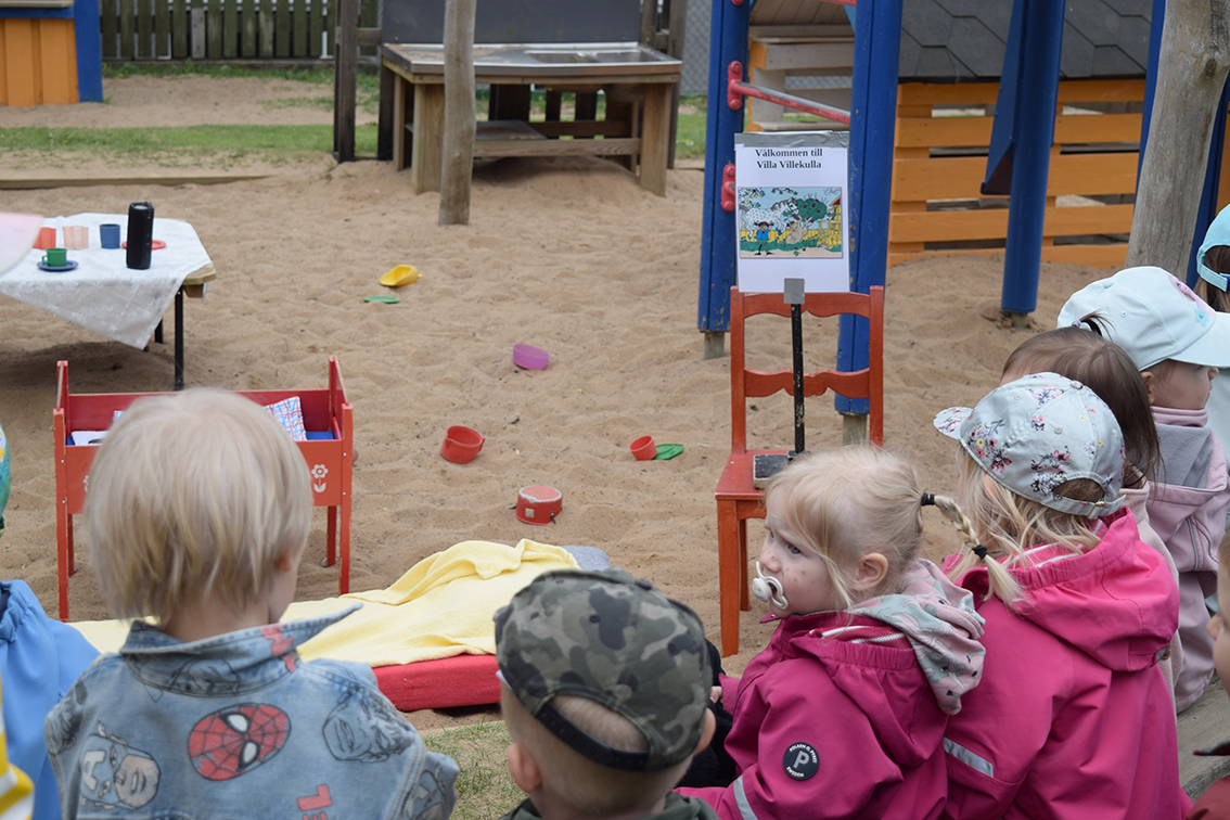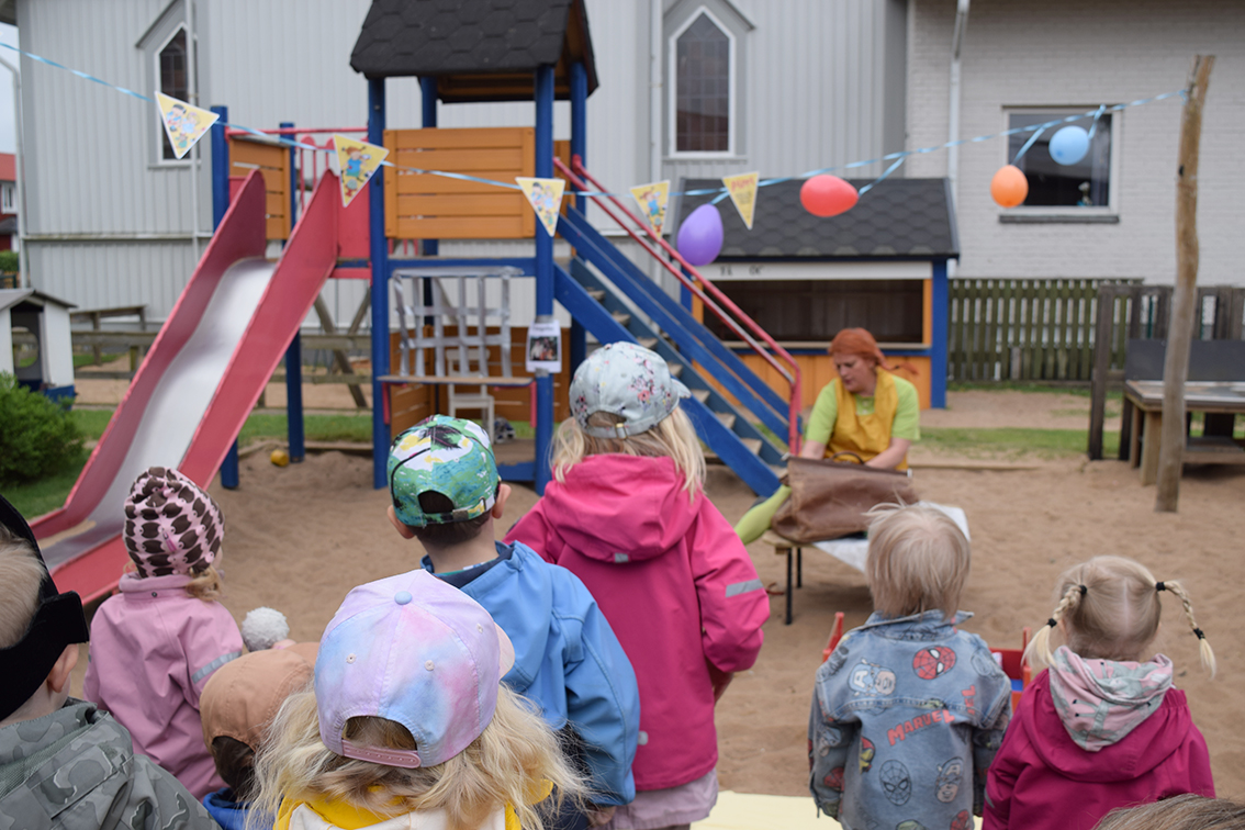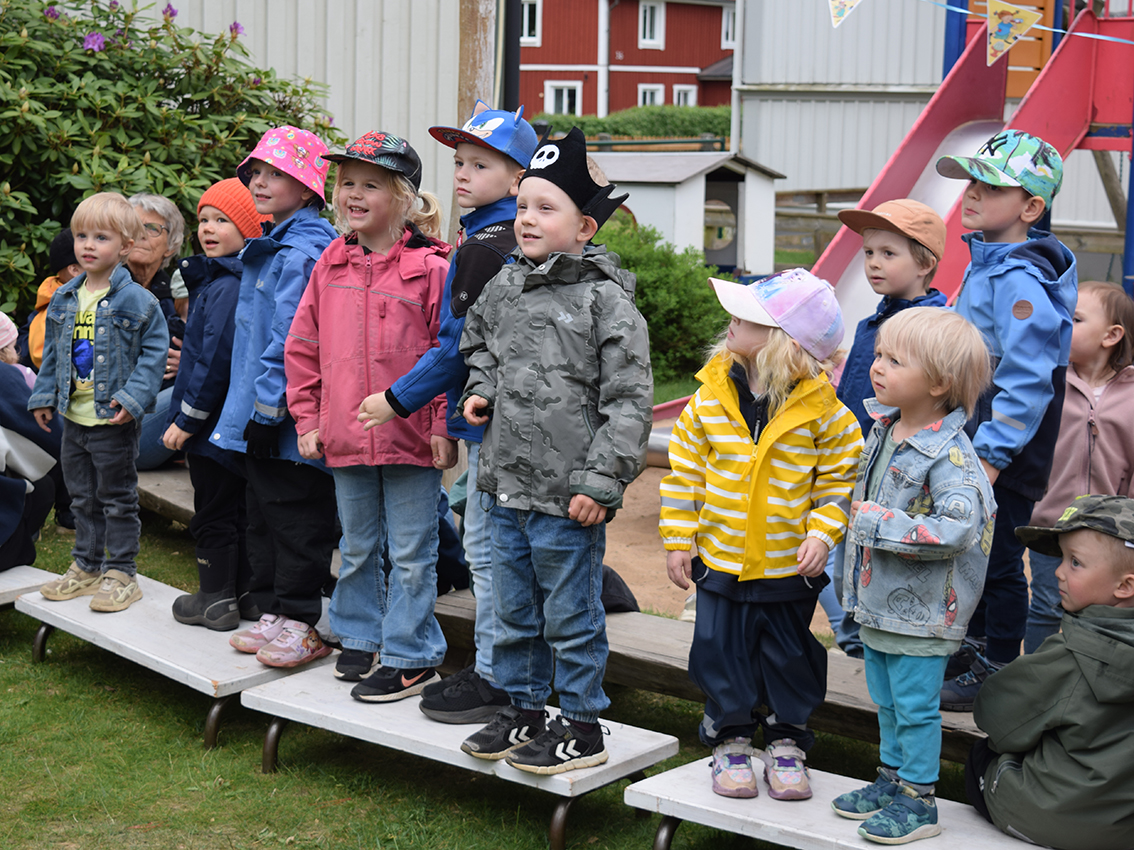 Förskolan Framtiden firade med kalas under onsdagsförmiddagen. Sandlådan fick agera scen och barnen tog plats intill scenen.