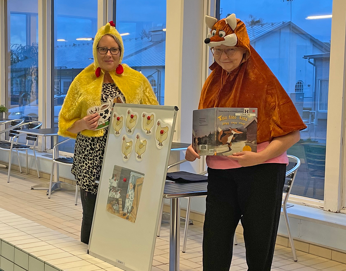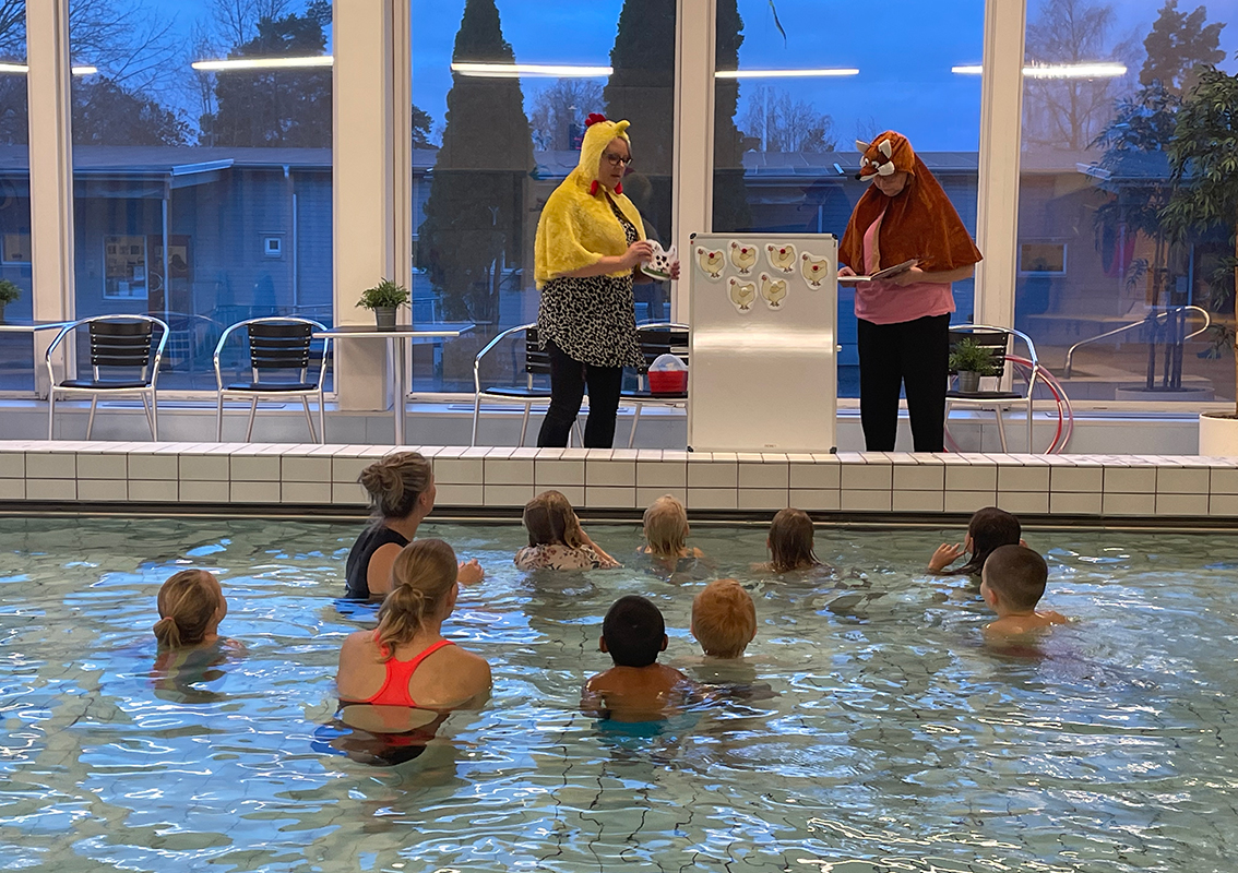 Femåringarna som skulle gå på simskola blev nog lite förvånade när Maria Sandström Låstberg, barn- och ungdomsbibliotekarie och Kajsa Folkesson, bibliotekspedagog stod utklädda bredvid lilla bassängen i Vaggeryds simhall. En av dem var utklädd till räv och den andra till höna. De läste sagan "Tass.. tass.. tass.. smyg.. smyg.. smyg" om den stackars bonden som försökte skydda sina hönor mot räven och alla andra möjliga faror. Barnen var väldigt intresserade och gjorde rörelser till dramatiseringen i bassängen.