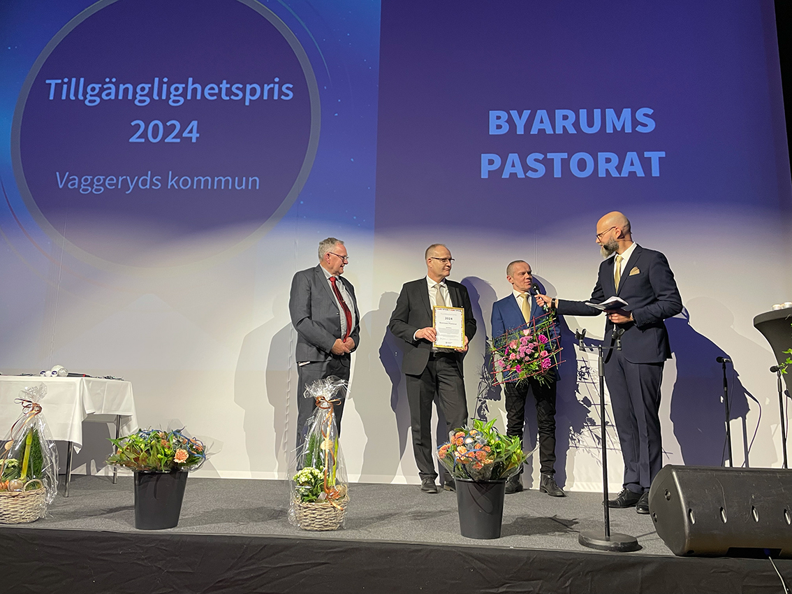Tillgänglighetspriset delades ut av kommunstyrelsens ordförande Gert Jonsson (M): – Vi delar ut årets pris i kväll till Byarums pastorat och motiveringen är med stort engagemang och hängivenhet har pastorat gjort sig tillgängliga då man ordnat buss till kyrkogård, social gemenskap, fika och en pratstund och inspirerar andra. Ett mer jämlikt och inkluderande samhälle för alla.