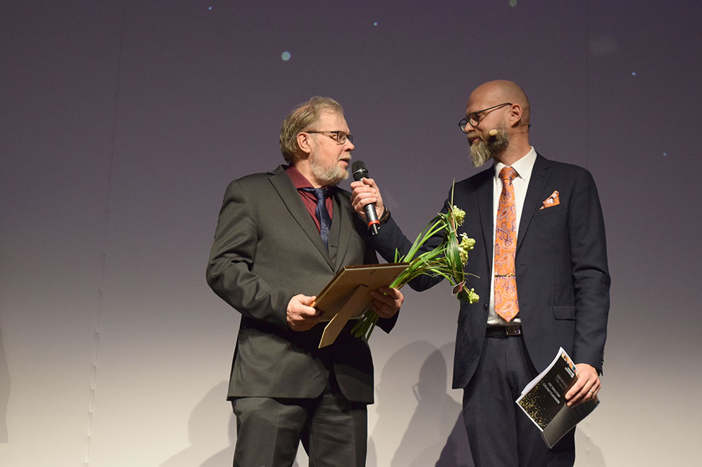 På scenen tog hembygdsföreningens ordförande Roger Andersson emot priset: