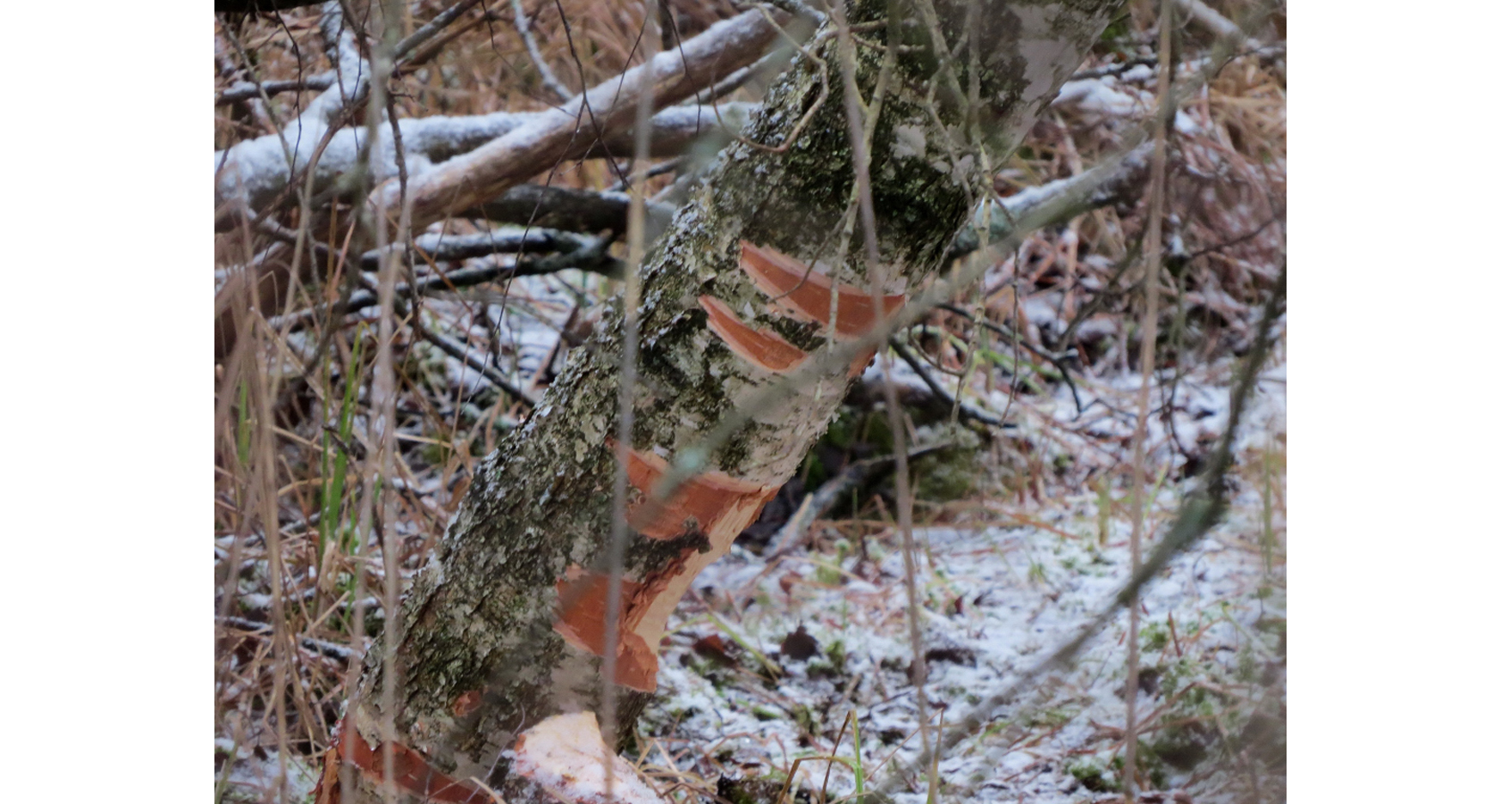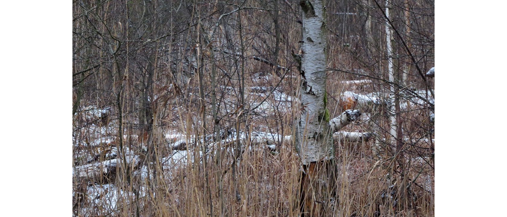De av bävern fällda träden styckas upp i lagom portionsbitar och förvaras i ett undervattensförråd.