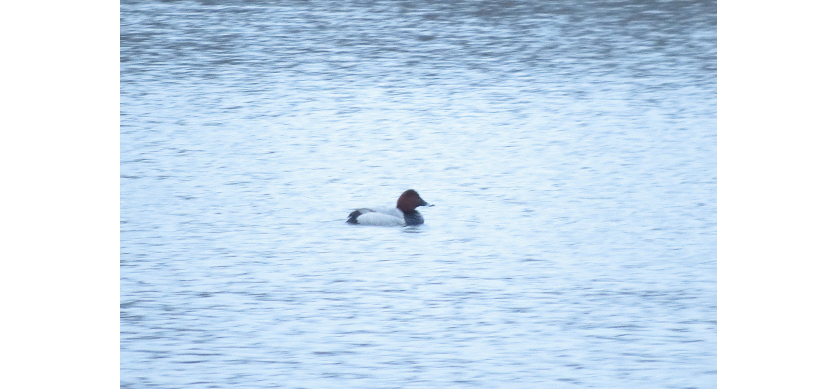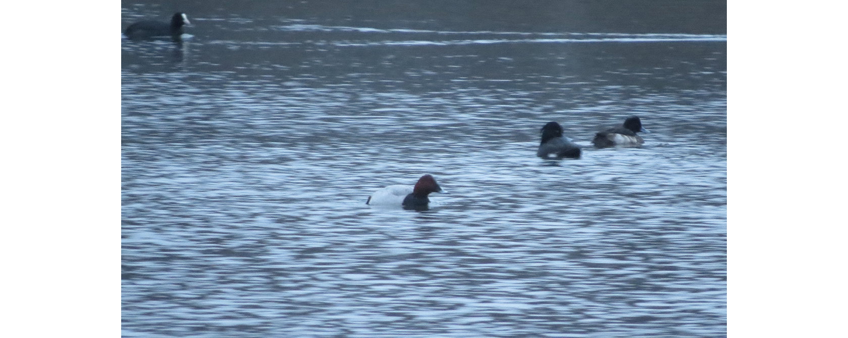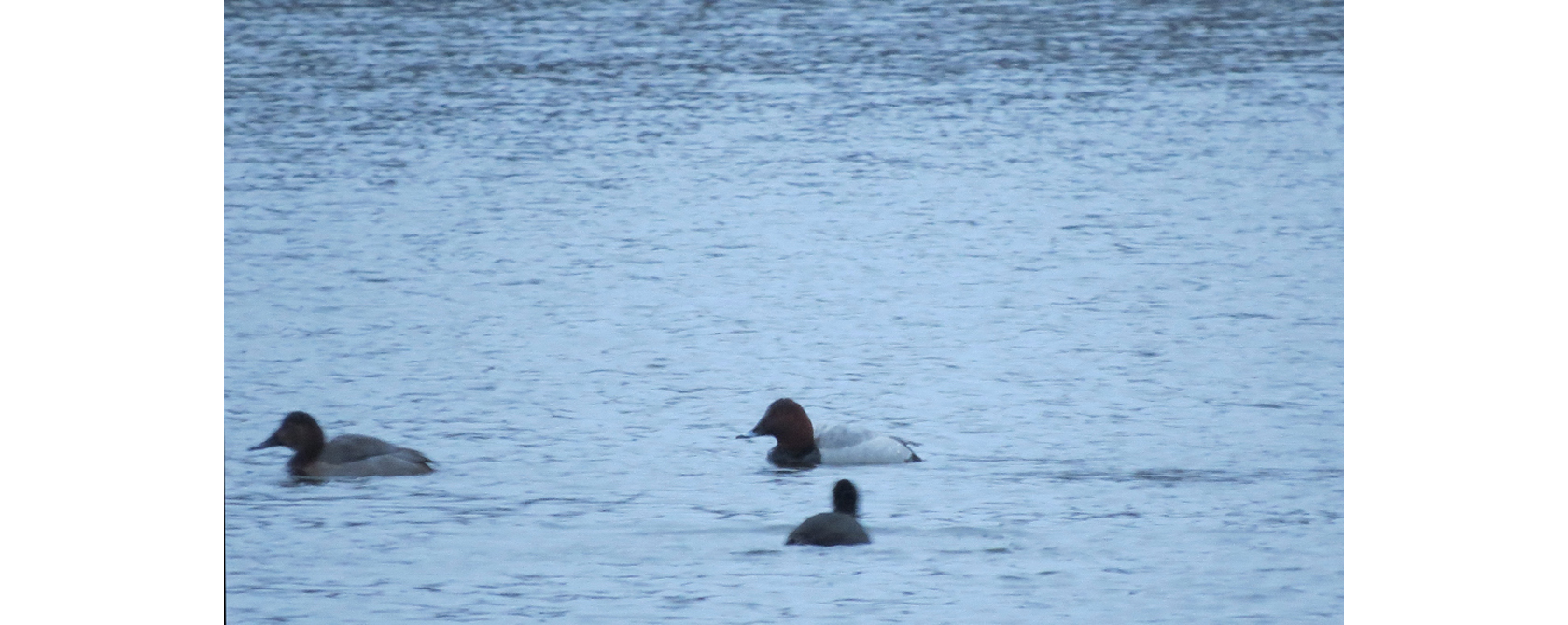Skymningen börjar falla denna midvinterdag och det börjar bli för mörkt att fotografera på fri hand därför blev bilderna som de blev men ett par brunänder, ”Aythya ferina”, kan man se att det är, honan till vänster och hanen till höger, framför hanen ligger en sothöna, ”Fulica atra”.