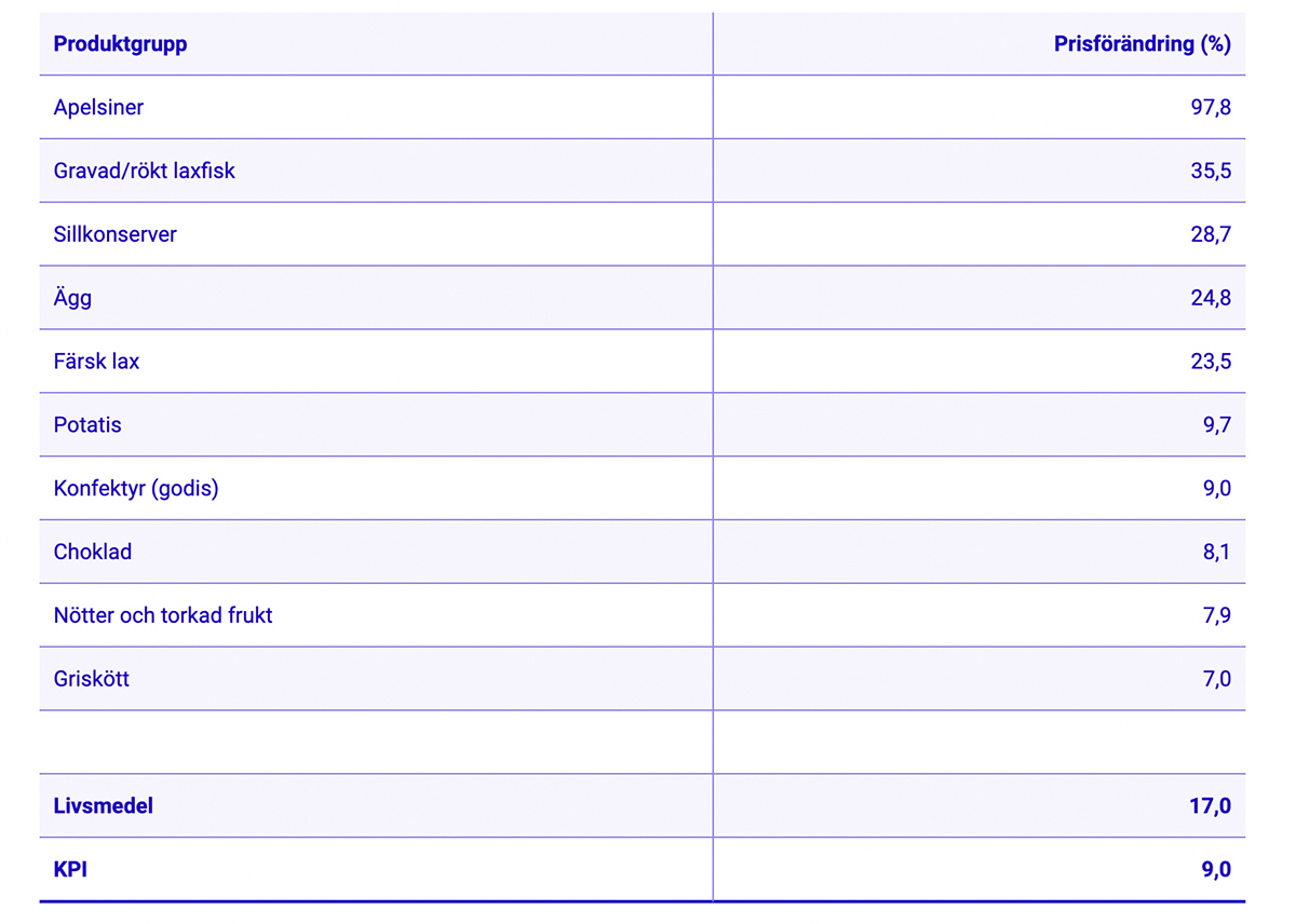 Det som ökat mest under året i procent är apelsiner som är nästan dubbelt så dyrt. Under 2022 har det generella priset på livsmedel stigit med 17 procent. Samtidigt har den generella prisutvecklingen på konsumtionsvaror och tjänster i Sverige stigit med 9 procent.