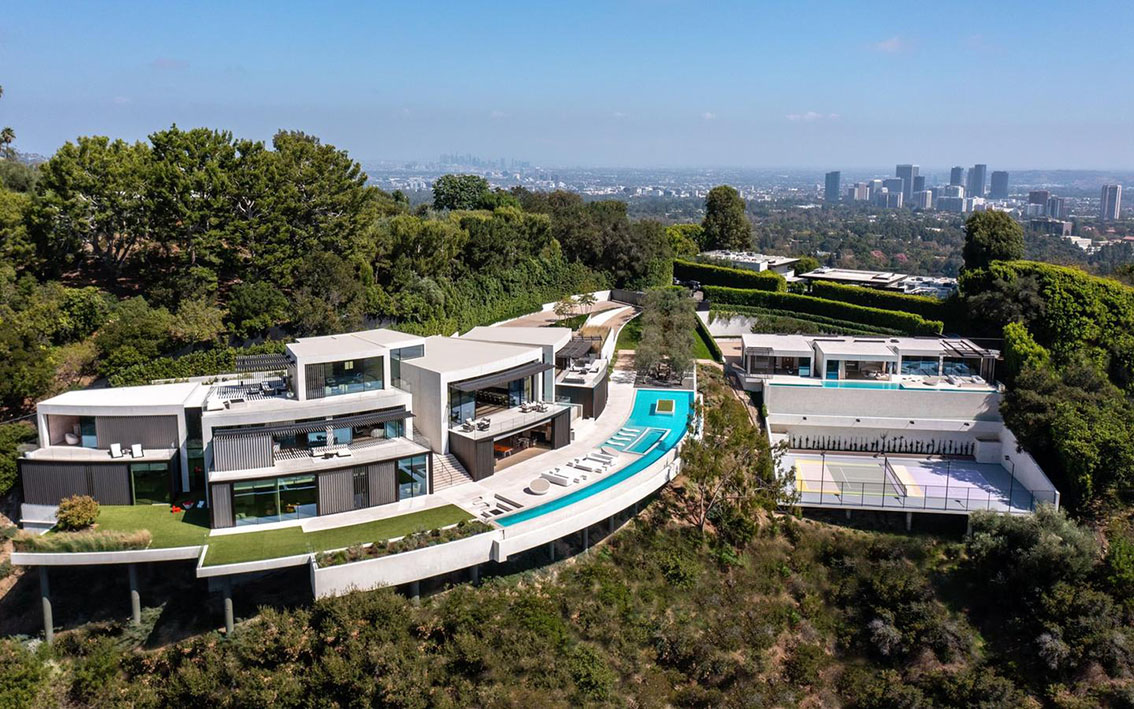 Ett nybyggt jättehus på 3 200 kvadratmeter med tio sovrum, 23 badrum, vinkällare, gym, poolområde, gästhus med pool och upplyst tennisbana i Bel Air i Los Angeles.