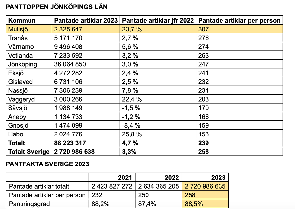 Trots att Jönköping var det län i landet som ökade mest i pantningsfrekvens så ligger man en bit under rikssnittet gällande pantade artiklar per person. 239 för länet. 258 för riket som helhet.