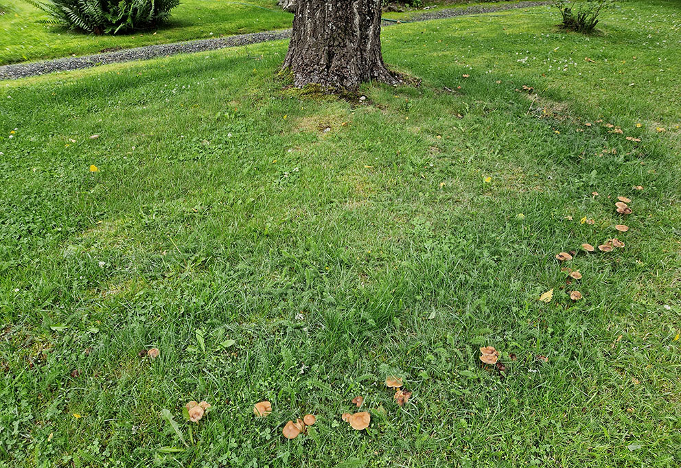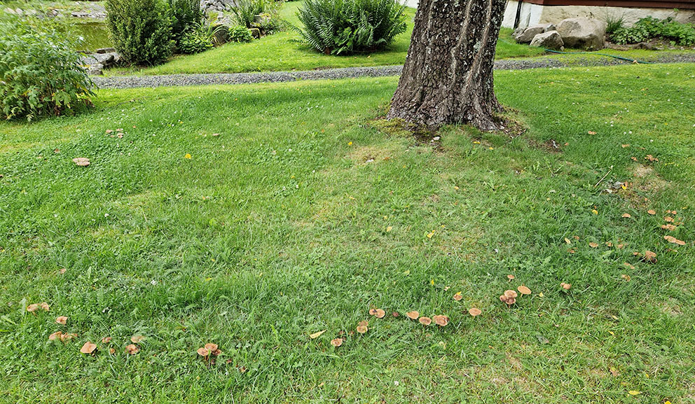 Den snälla varianten av häxring gynnar gräset genom att frigöra kväve och det syns på gräset intill häxringen att det är riktigt saftigt grönskande.