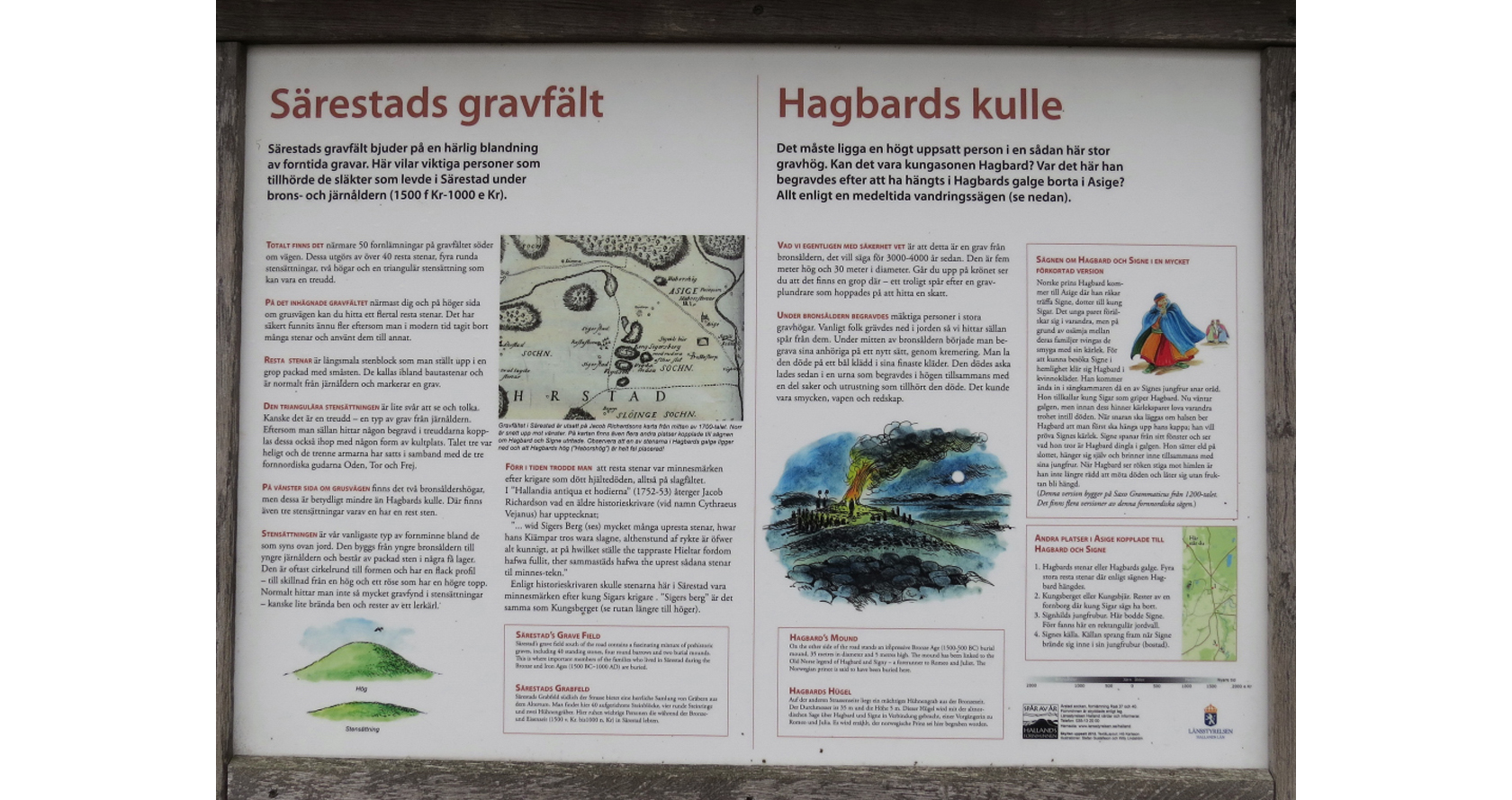 Särestads gravfält samt Hagbards kulle och galge, en natur- och kulturkrönika i 13 bilder från tiden mellan bronsålder och äldre järnålder samt mellan saga och sägen i Asige öster om Falkenberg.