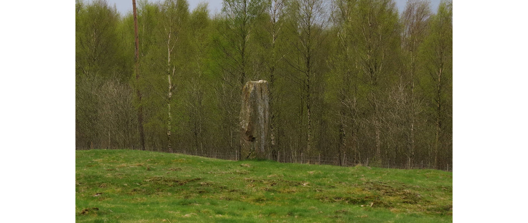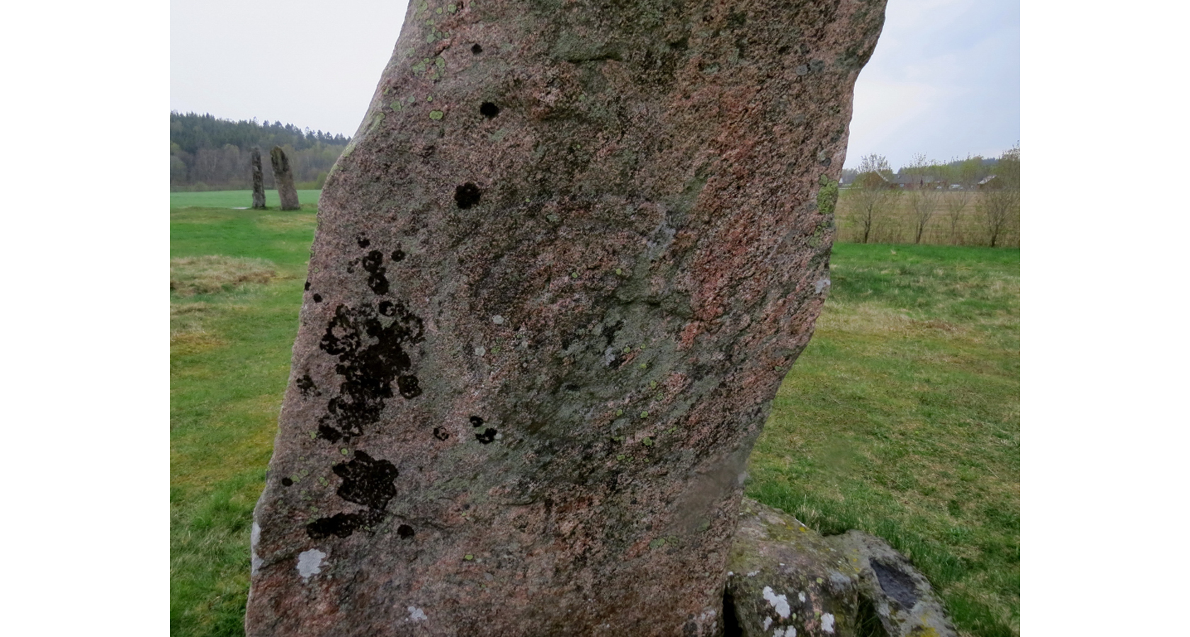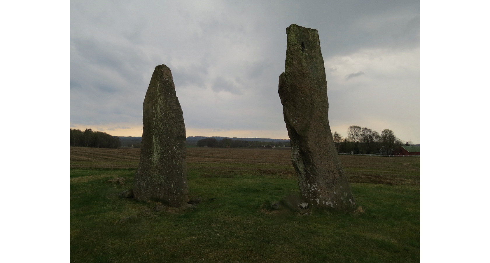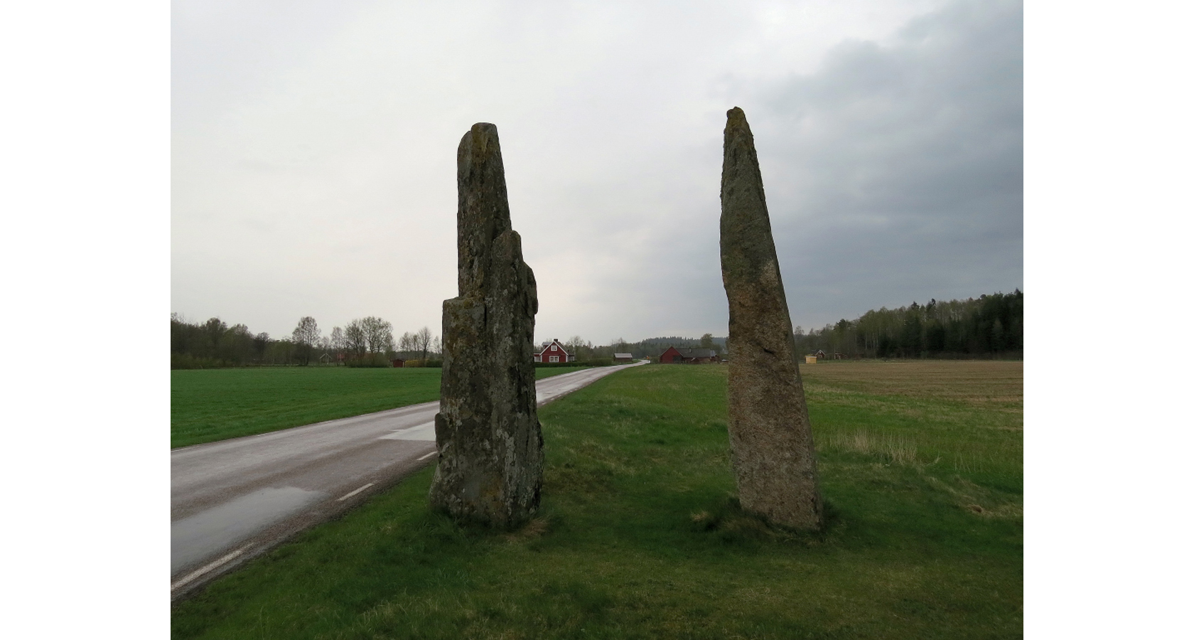 På andra sidan om den lilla grusvägen och snett över den stora vägen står denna resta jättesten eller megalit till synes alldeles ensam.