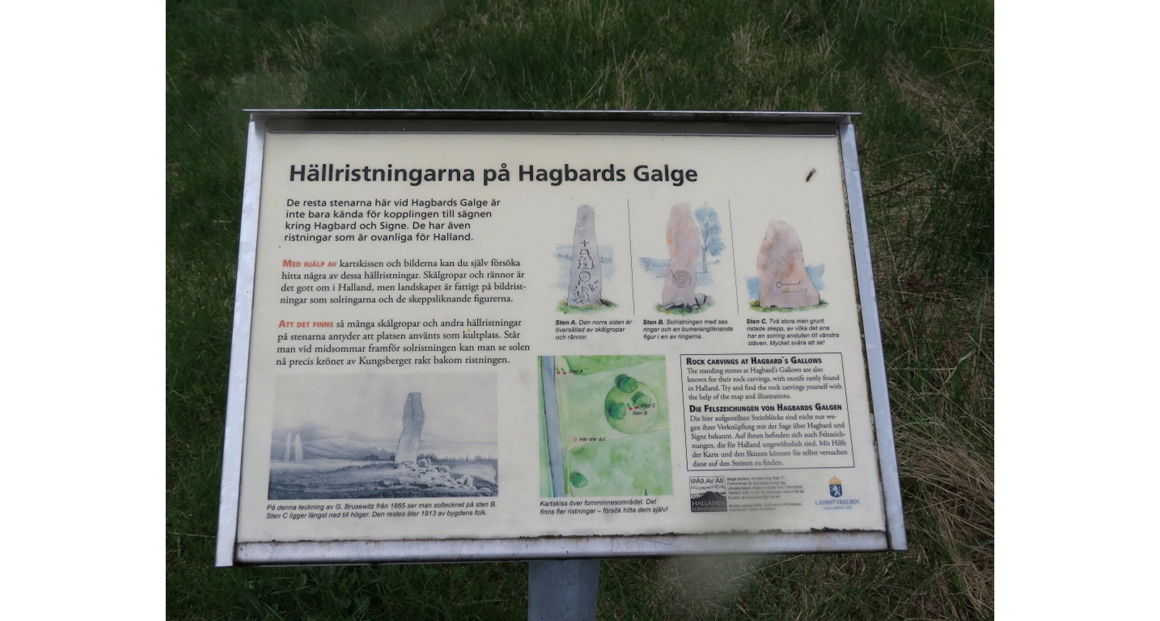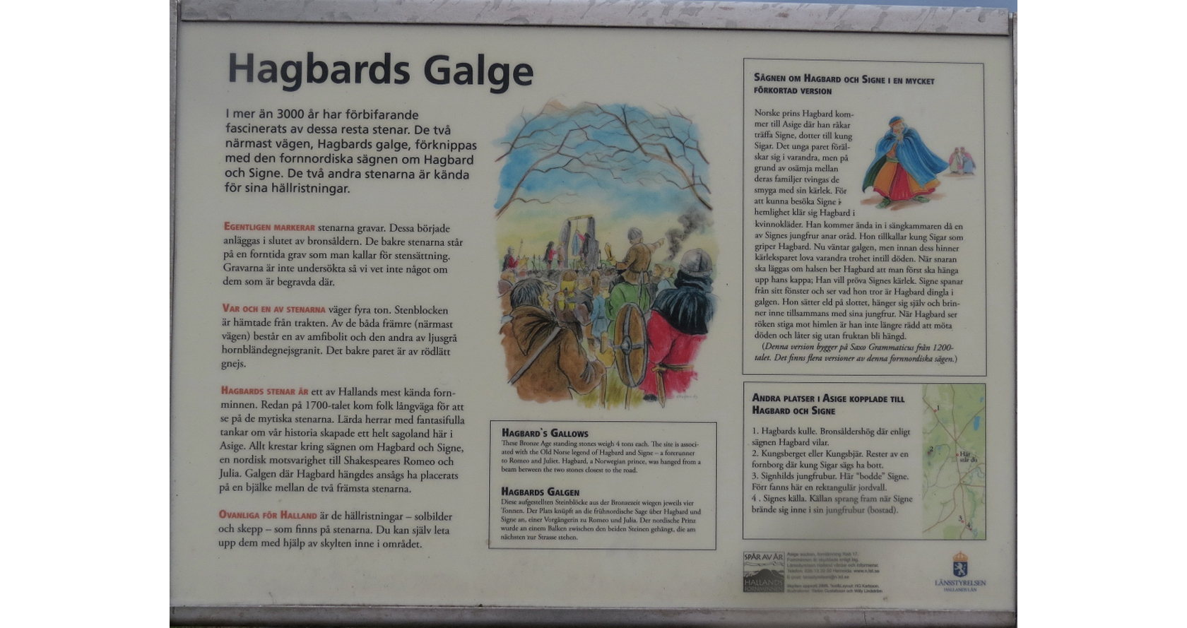 Bilden visar ännu en fantastisk informationsskylt, denna i anslutning till Hagbards galge och texten berättar om de ristningar som man kan se på de stora stenarna.