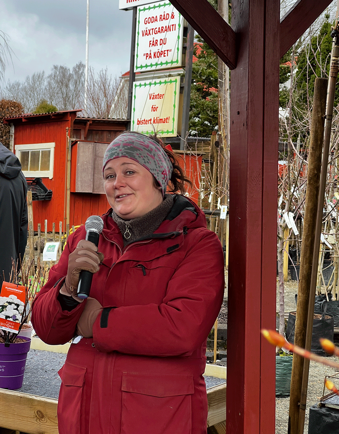 Kajsa kunde hälsa närmare trettio trädgårdsintresserade och blomsterälskande seniorer välkomna och började med en intressant tillbakablick över företagets historik. Sedan var det dags att presentera årets nykomlingar inom plantor och andra växter. Kajsa började med årets pelargon och den har fått namnet Hilma. Denna växt fick senare en strykande åtgång bland de köpsugna gästerna. En ros, kallad Agda, som har fått tillnamnet honungsros, presenterades och även olika sorters nya hortensior. Vad är en jordgubbshallon, det kan man fråga sig men nu finns denna växt att köpa, ursprungligen uppodlad i Ålaryd. ”Hur smakar bären?” Ja, det finns inget direkt svar. Penséer är alltid populära vid denna årstid och det visades olika färger, med de persikofärgade som mest populära.