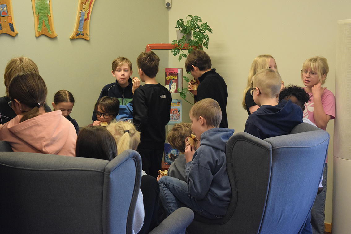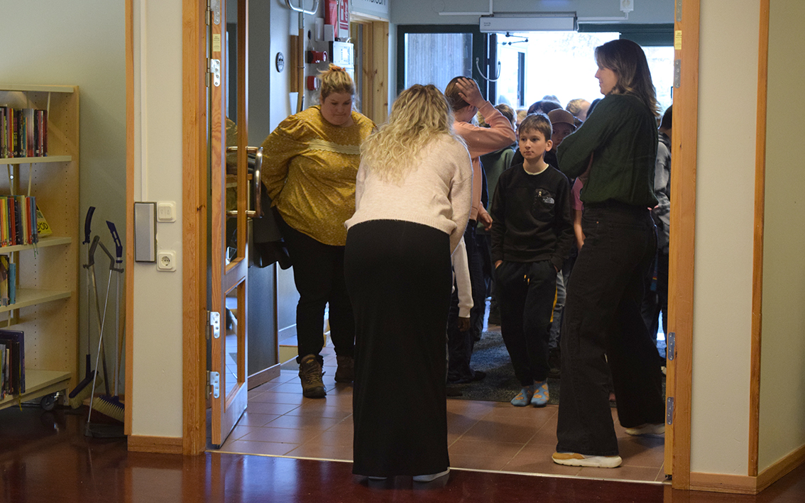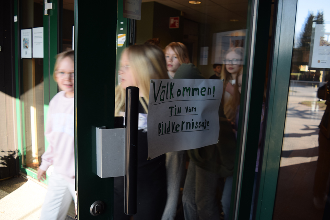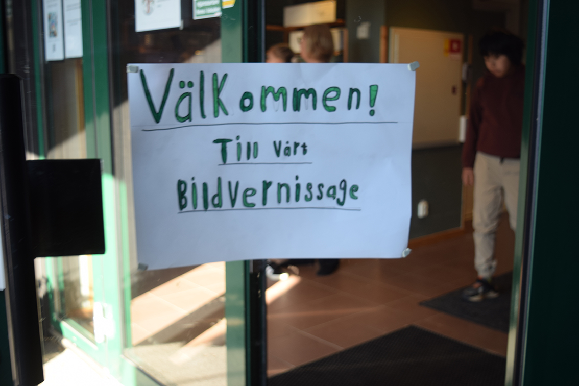 När vi anländer till Sörgårdsskolan är det årskurs tre:s tur att få se bildvernissaget. August och Emma höll välkomsttal.