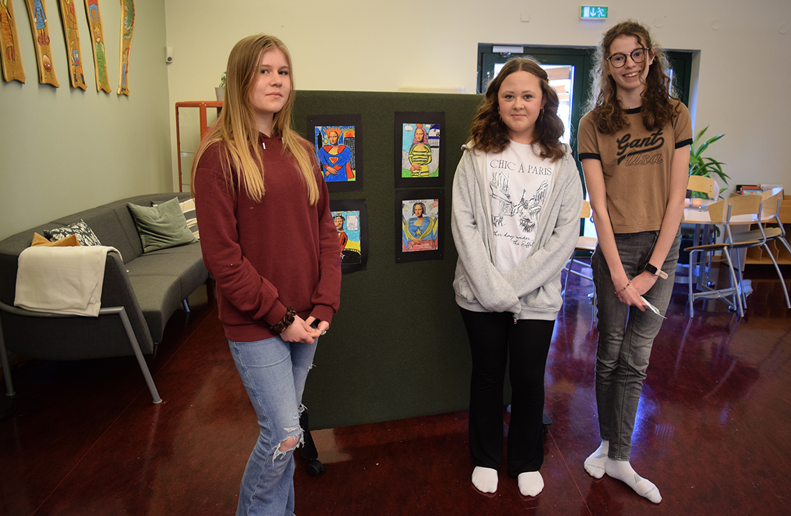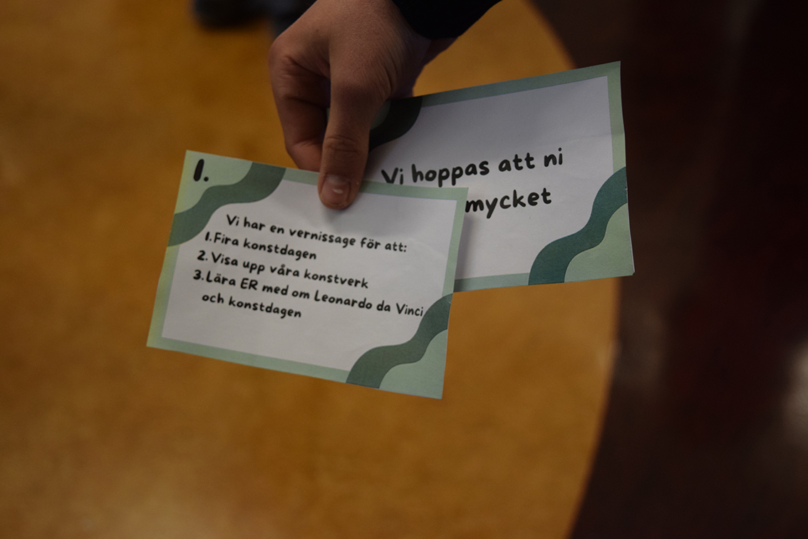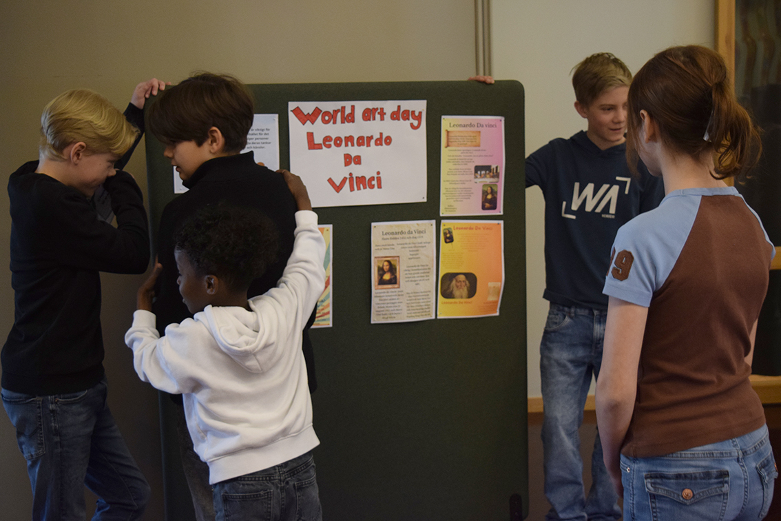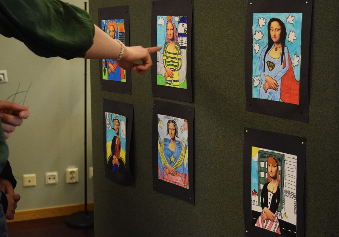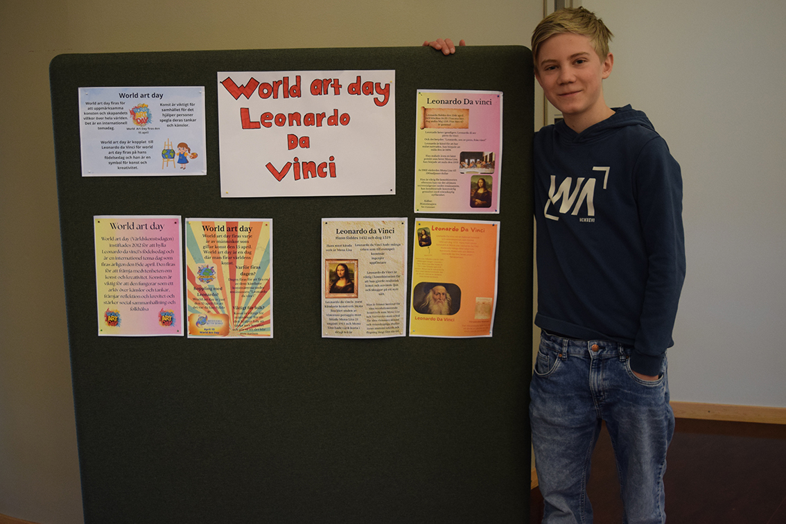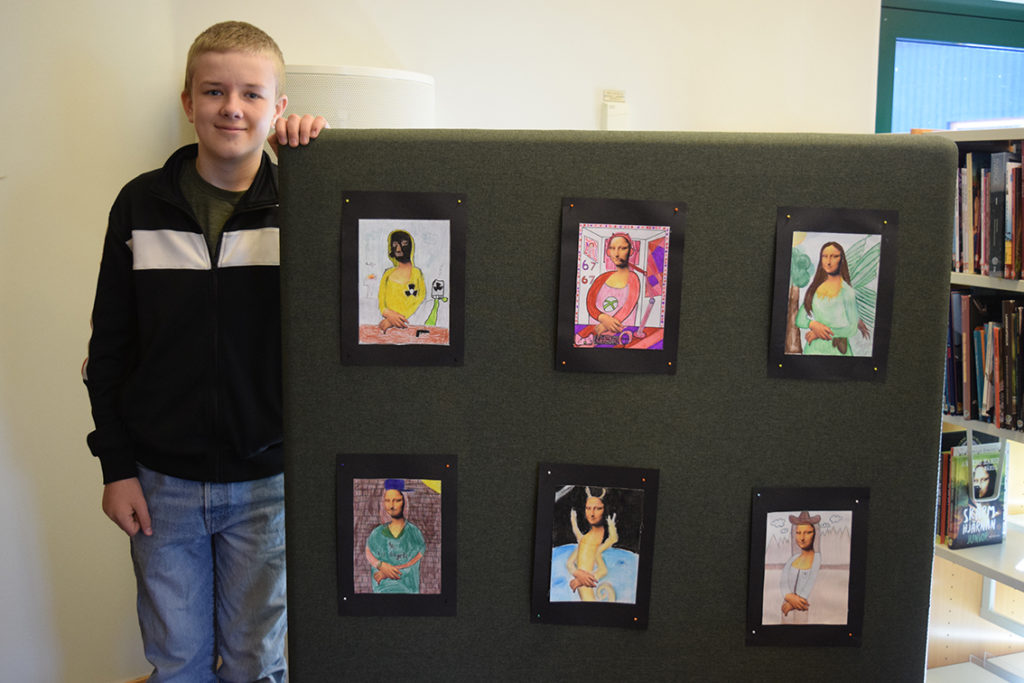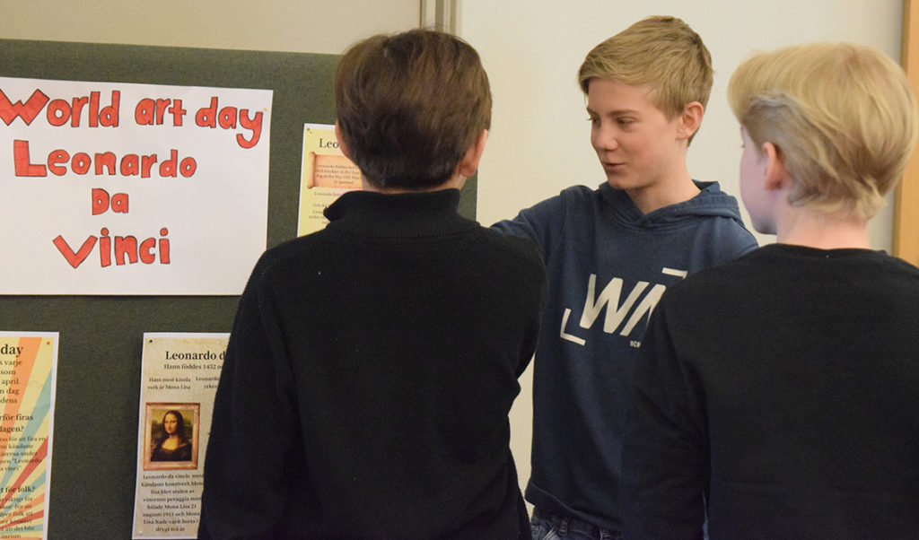 – Vi har jobbat med temat ”World Art Day”, Leonardo da Vinci, parafraser och bilder. Under dagen har vi delat upp vernissaget i halvtimmesdelar så att alla elever på skolan kan komma hit och se vad årskurs 6 har jobbat med. Totalt under förmiddagen kommer 250 elever samt personal kika in här hos oss. Efter rundturen blir det fika.