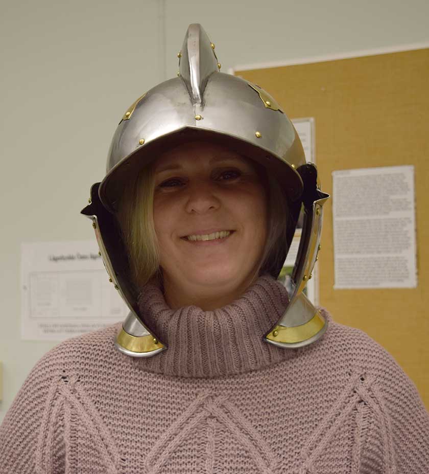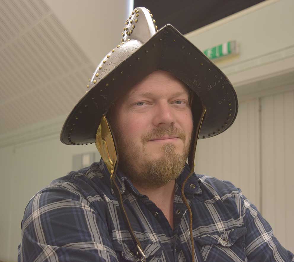 Elin och Mattias förbereder i Lägerhyddan. Här med rekvisita som huvudbonad.
