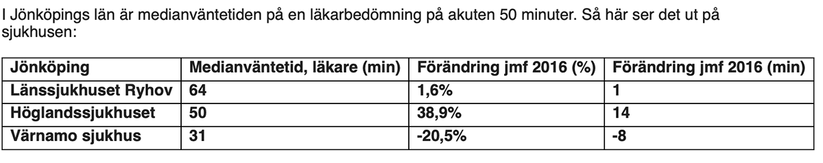 Bara fyra akutmottagningar runt om i landet har enligt statistiken kortare väntetid på läkare än Värnamo sjukhus. Sjukhuset är också i topp när det handlar om hur mycket man sänkt väntetiderna från 2016.