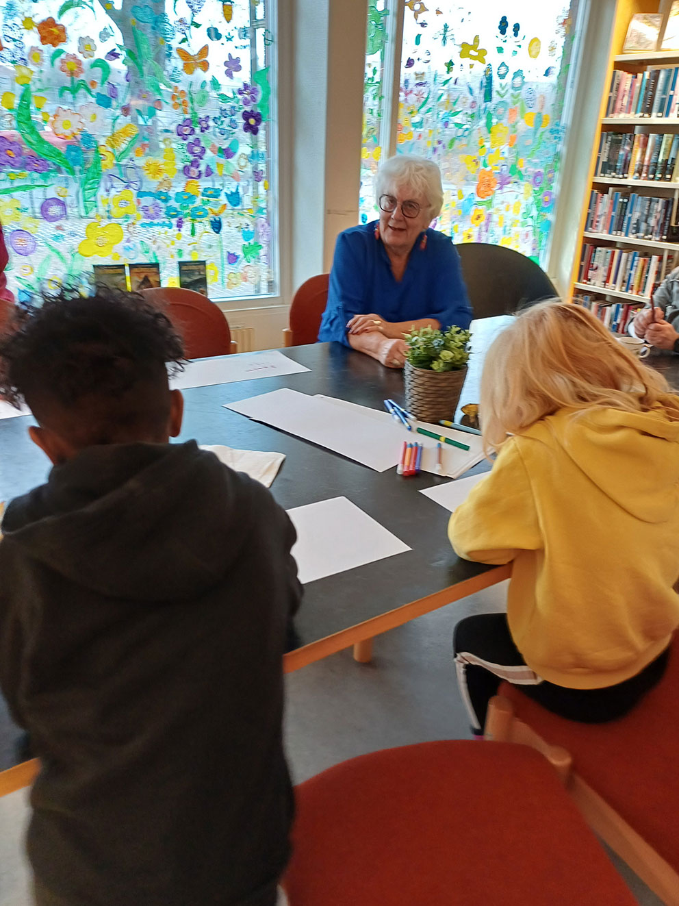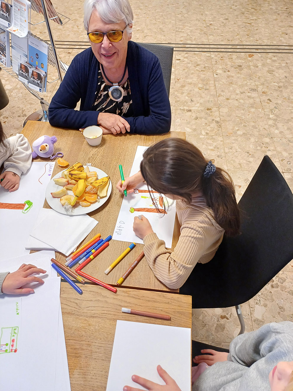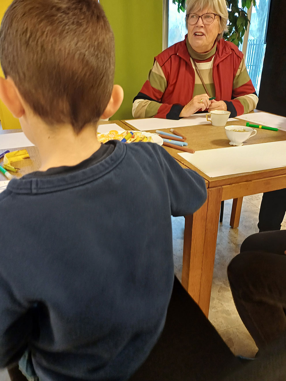 Några barn stannade i teatersalongen efter föreställningen där det bjöds på fika- och fruktstund tillsammans. Pensionärerna och barnen pratade, ritade och skrev om vad de hade sett och hört.