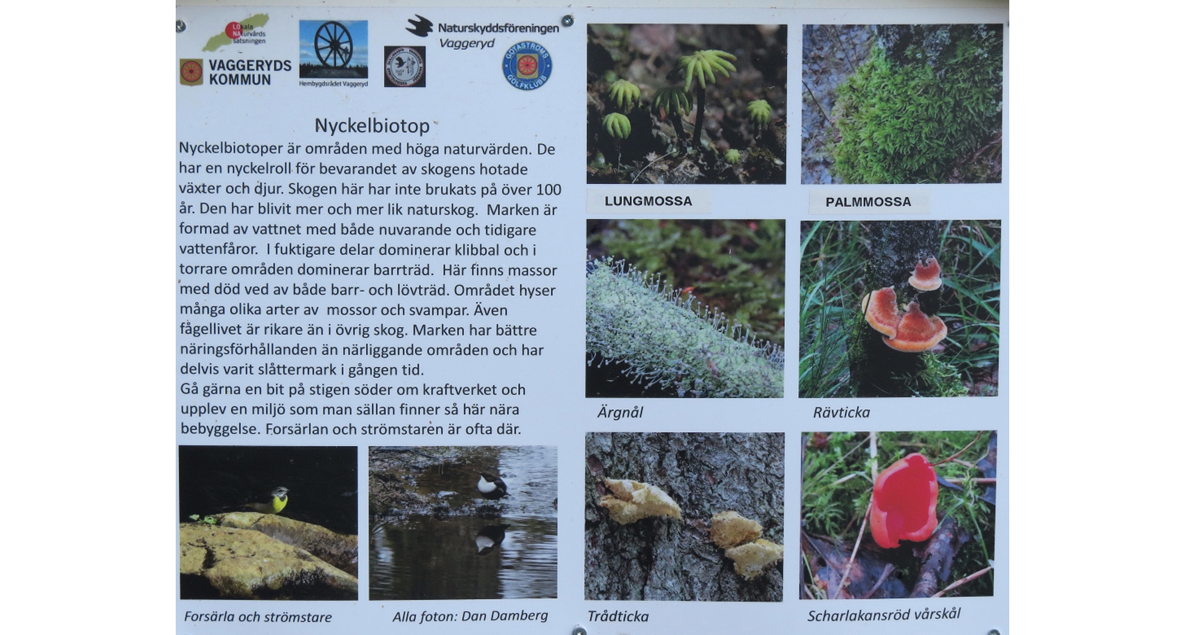 Alldeles innan man kommer fram till kraftstationen vid Fågelforsdammen hittar man denna informationsskylt som visar några av de rariteter som finns inom nyckelbiotopen som utgörs av gamla åfåran från dammen till Lagans nuvarande och ordinarie åfåra.