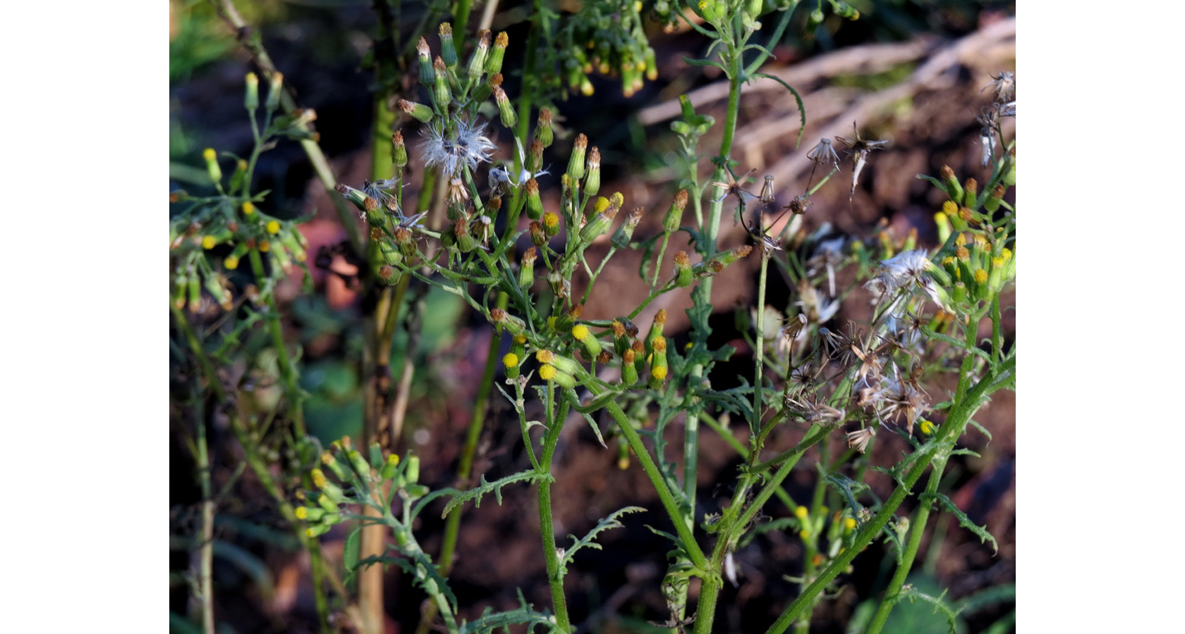 Blomkorgarna är ganska smala och saknar ofta strålblommor, arten blommar vanligtvis från juni till september men nu är det mitten av november.