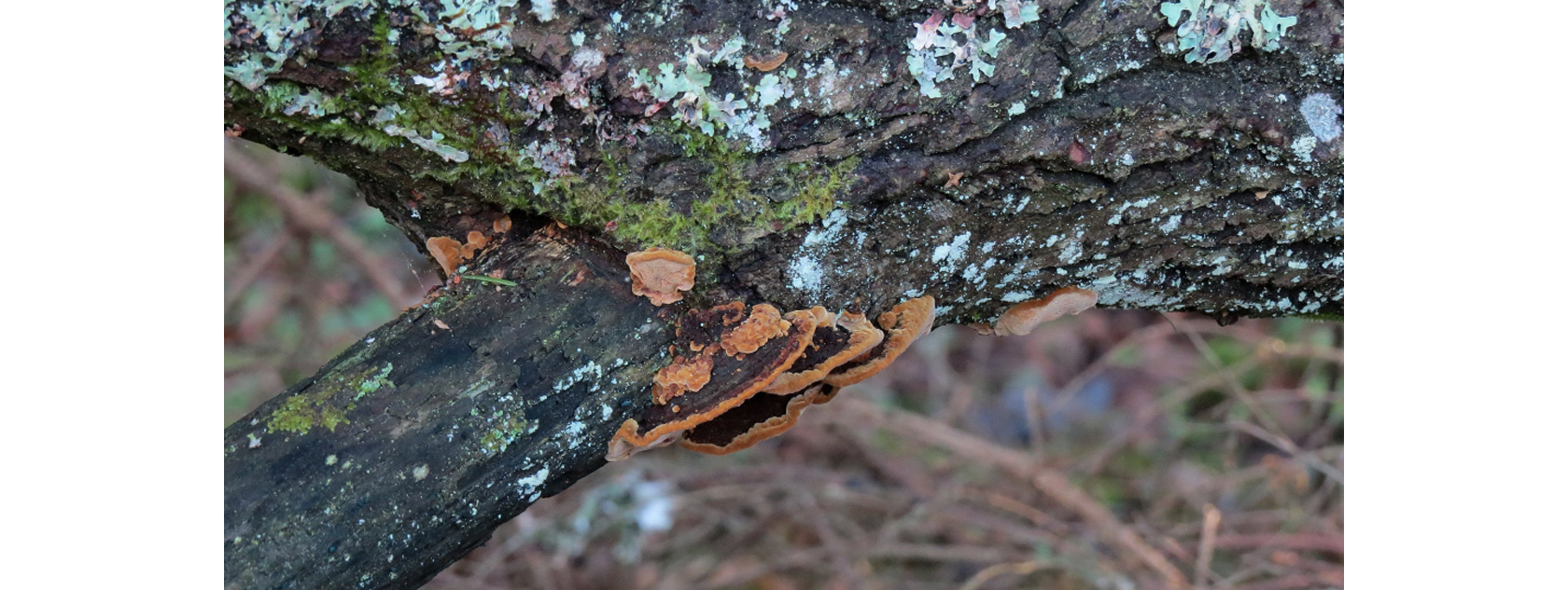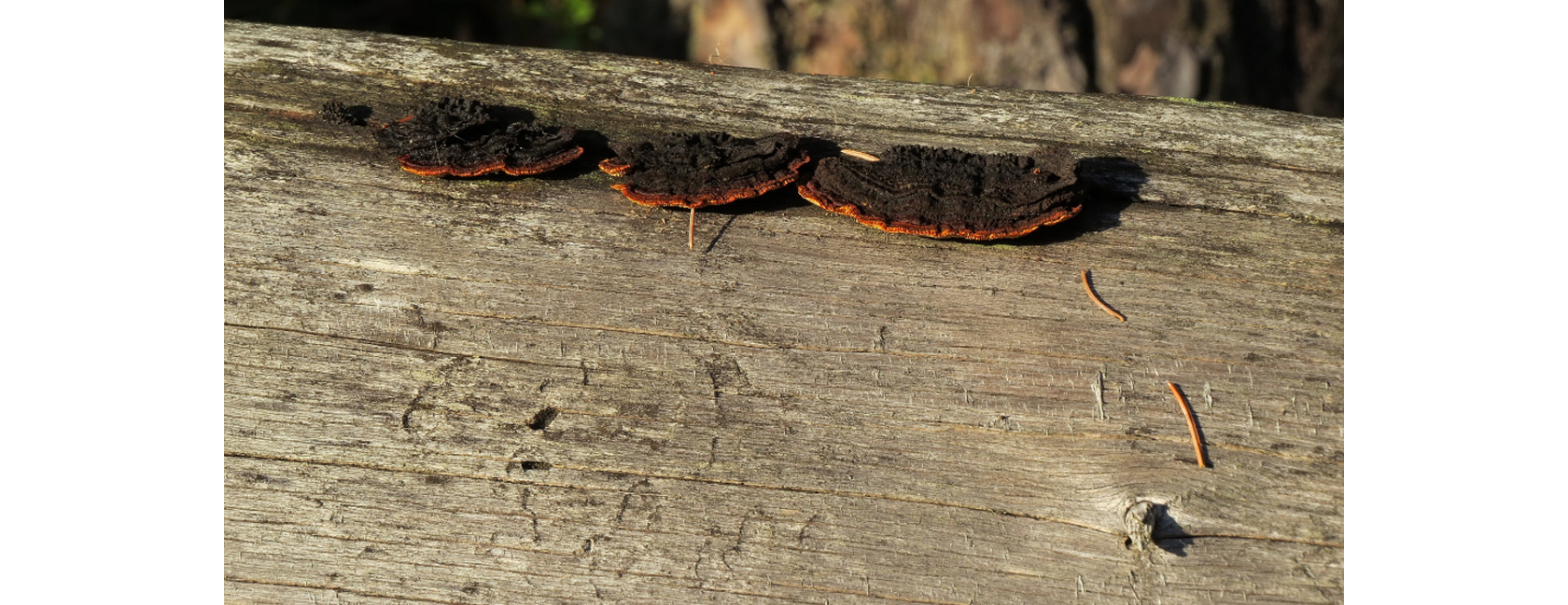 På den vackert ljusgrå tallågan växer svamparten vedmussling, ”Gloeophyllum sepiarium”, som gärna växer på torra och solexponerade lokaler precis som här.