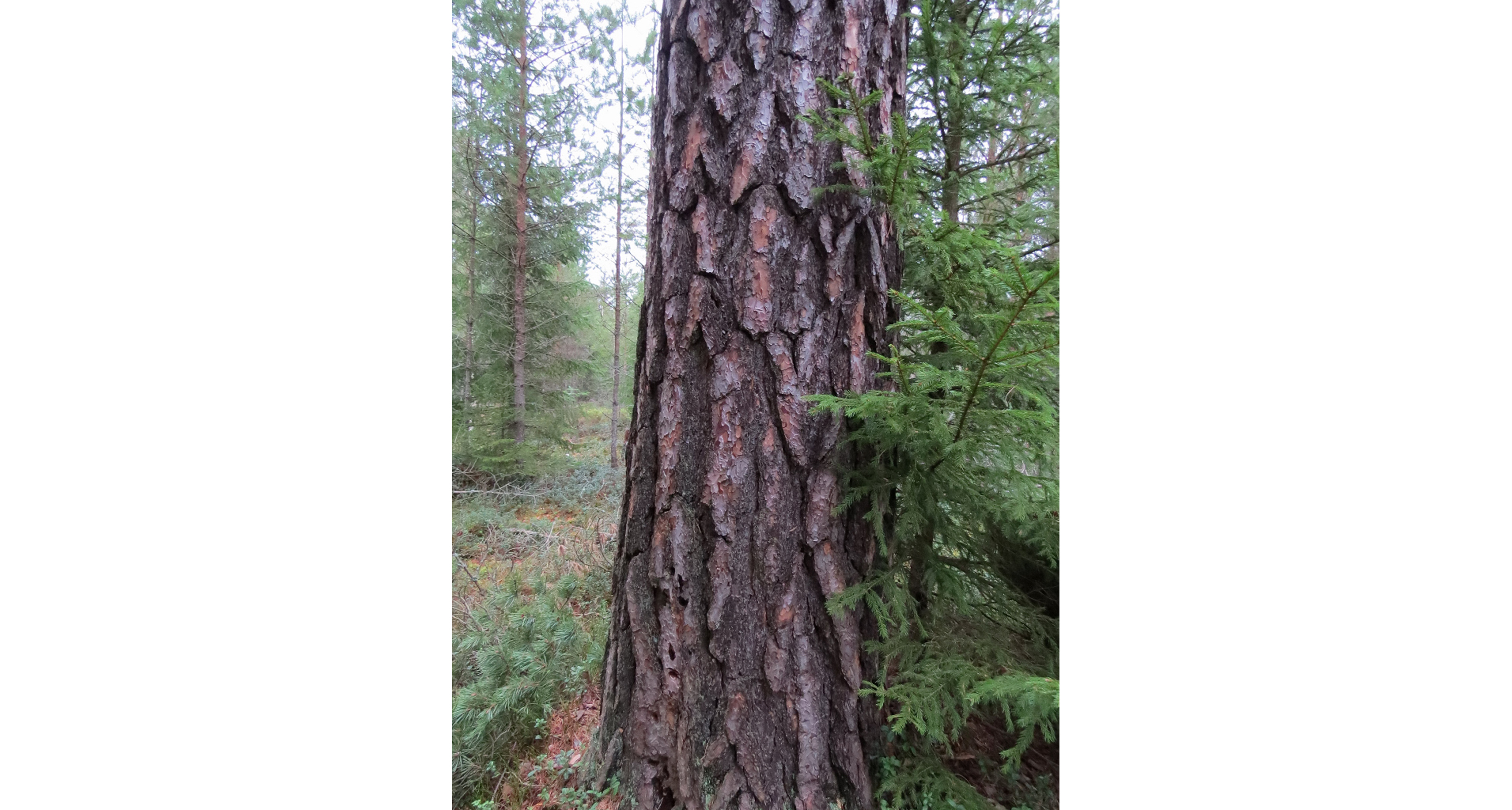 Ståtliga tallar som dessa kanske kan locka till sig den sällsynta och rödlistade reliktbocken som genom att sitta under en barkflaga och slå ryggen mot den, alstrar ett typiskt smattrande ljud.