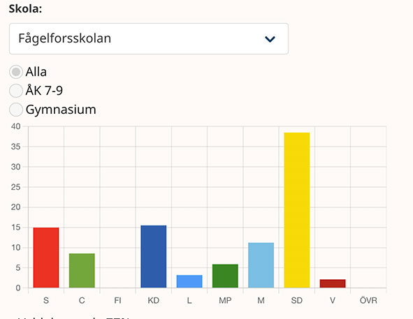 När skolvalet genomfördes på kommunens grundskolor 7-9. 77 procent av eleverna på Fågelforsskolan i Skillingaryd röstade och på Hjortsjöskolan i Vaggeryd var valdeltagande 81,4 procent