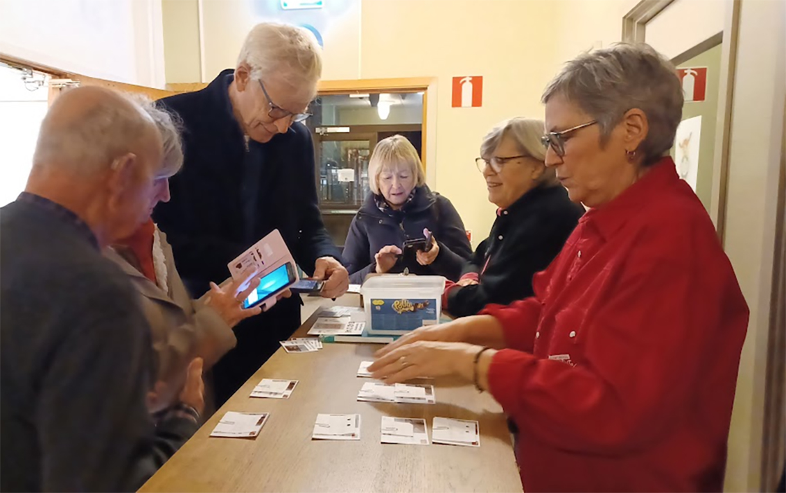Några i slutet av biljettkön: Lars-Erik och Lotta Karlsson, Kåre Boberg och Margareta Fredén. Gunilla Otterberg och Lotta Storck höll ordning på biljetterna.