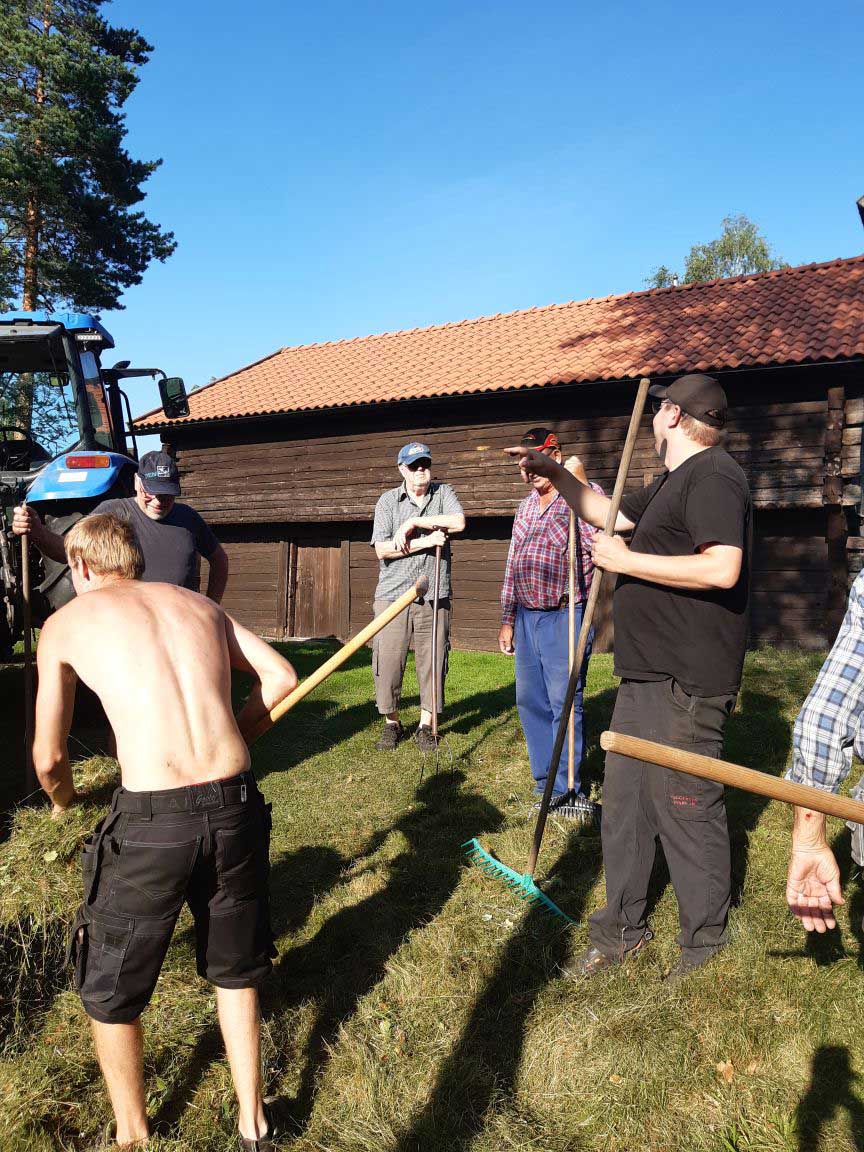 En gång om året samlas medlemmar från hembygdsföreningen för att hålla ordning på ängen inför hösten. Det används såväl gamla som lite modernare verktyg för att göra jobbet. För de som kan är lien ett effektivt redskap som ser till att det blir snyggt och rent.