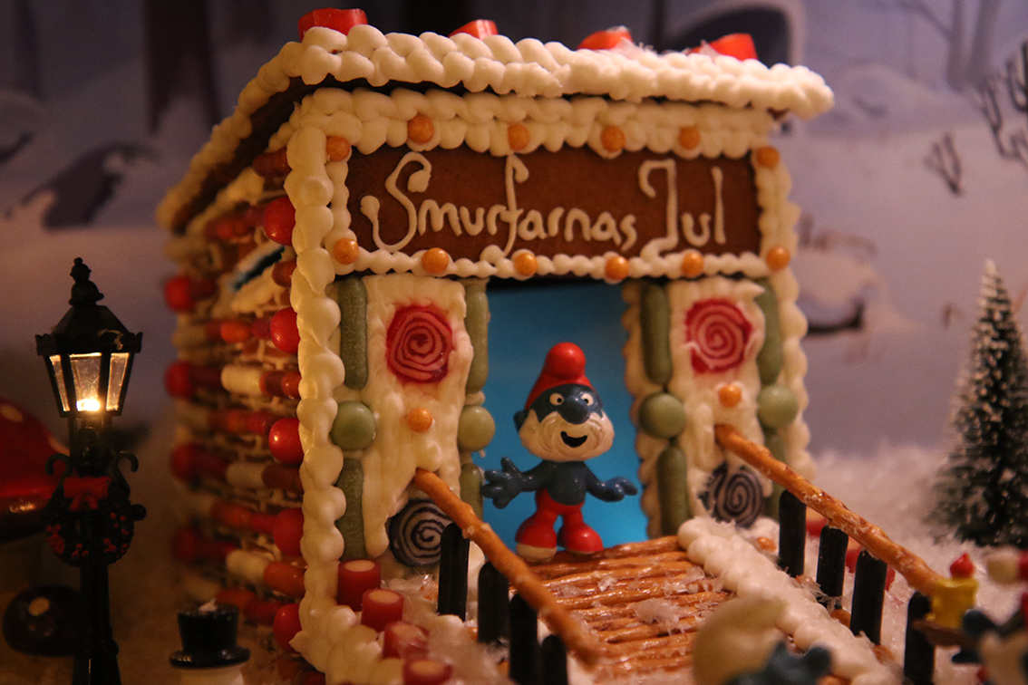 – Ett år så hade pepparkakshuset helt plötsligt fått en källarvåning där smurfarna hade ställt till med julfest och det var där det hela tog fart. Och Smurfarnas Jul började efter det utöka mer och mer. Vi började knåpa ihop egna modeller av pepparkakshuset. De senaste åren har det fokuserats på att försöka spegla något som vi gjort under året. I år har vi till exempel gjort en slags tunnelbanestation då vi åkte mycket tunnelbana i somras på vår semester. Förra året var det en variant av kruttornet i Visby ringmur men vissa år har det ingen koppling alls. Det är bara att försöka få till nåt annorlunda – aldrig mer färdig byggsats! Även om det inte är några mästerverk så är de unika, ett år klistrade jag ihop ett hus av sockerbitar, säger Carolina Sjögren. Det blev en rejäl pjäs.