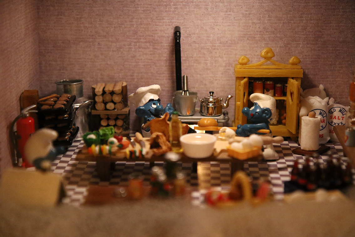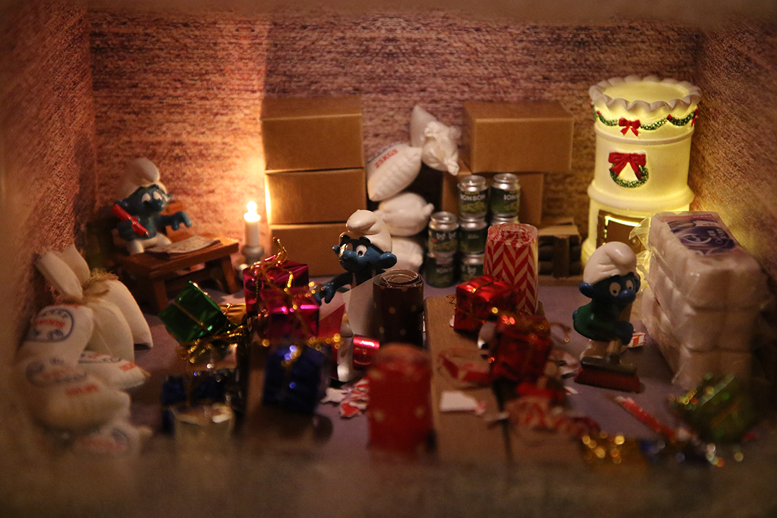 Vi letar ständigt efter ”nisse-tillbehör” som kan passa in eller andra dockskåpsdetaljer. Just i år har vi fokuserat en hel del på beredskapsprylar. Så nytt för i år är flertalet brandsläckare, massor av konservburkar som är bra att bunkra till behov. Säckar som innehåller kilovis med mjöl, socker och salt. En liten flirt till prepper-världen helt enkelt - var förberedd om krisen kommer. Till exempel har ju smurfarna laddat upp med ett par rejäla balar med toapapper.