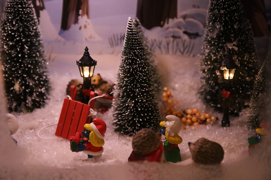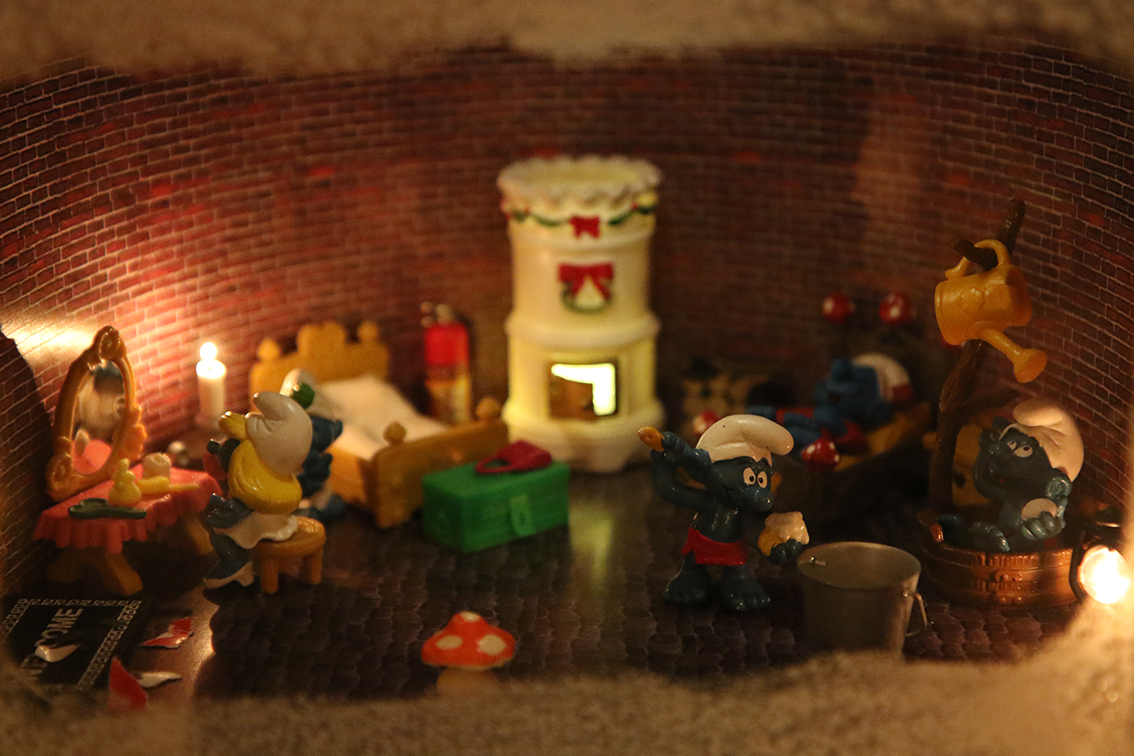 Efter hand så har då smurflandskapet vuxit både i storlek och detaljrikedom. Nu har det spridit ut sig över fyra sektioner Billy-bokhylla, så visst har det växt! Och de flesta skåpen har dessutom smurfar på två hyllor. Att bygga en miljö blir som ringar på vattnet, vi vill bygga mer! Det finns en tanke kring varje ”sektion”, att varje del blir som en egen liten saga, ett kapitel på vårt lilla Instagramkonto. Eftersom vi har så många olika slags smurfar så får de bilda handlingen. Under resten av året letar vi alltid efter speciella och säregna figurer. Smurfen som sitter vid skrivbordet och skriver listor är ett Traderafynd som var helt klockren till vår tomteverkstad. Och vi har redan planer och idéer för nästa års landskap, så nu gäller det att hålla ögonen öppna för att hitta passande figurer till det.