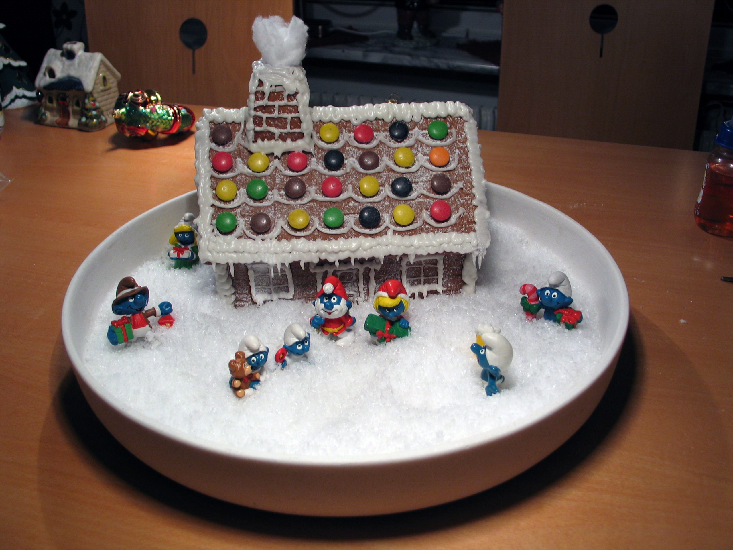Sedan flyttade vi till hus och då fick pepparkakshuset flytta in på en hylla i vårt vitrinskåp, då blev det mer tittskåpskänsla över det. Och för att det skulle få stå i fred för små nyfikna barnafingrar såklart. Det var fortfarande pepparkakshuset som hade fokus, ett helt vanligt byggsatshus från Mor Annas pepparkakor. Och det var fortfarande en blygsam mängd smurfar som fick vara med.