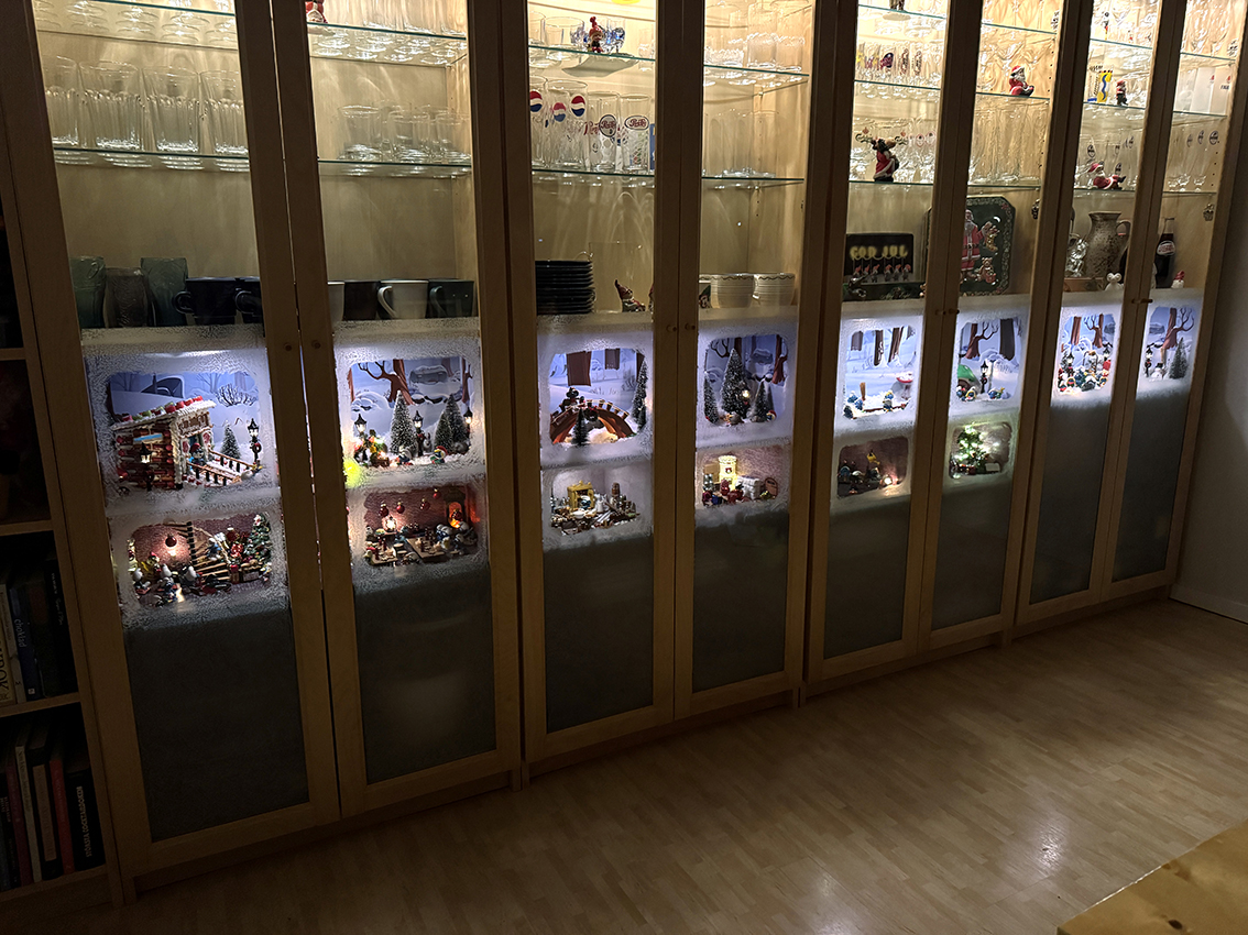 Alla lyktor och lampor har till exempel inkopplad el nu, det hade det inte från början. Eldstäderna har fått liv genom att Anders har satt små ledlampor i dem. Under all snö ligger cirka 42 meter kabel gömd.